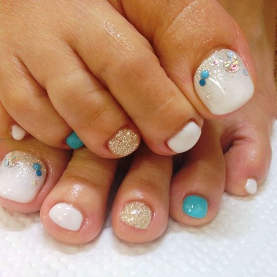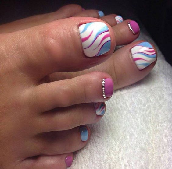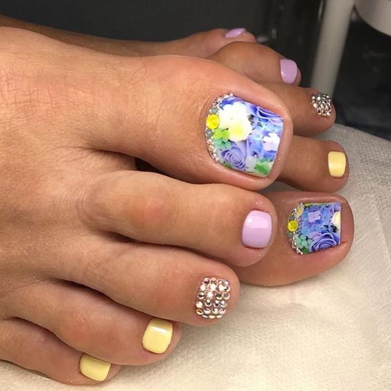 Pédicure de couleur tendance avec des strass.