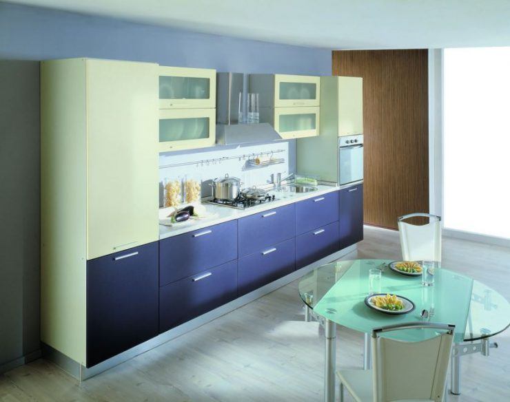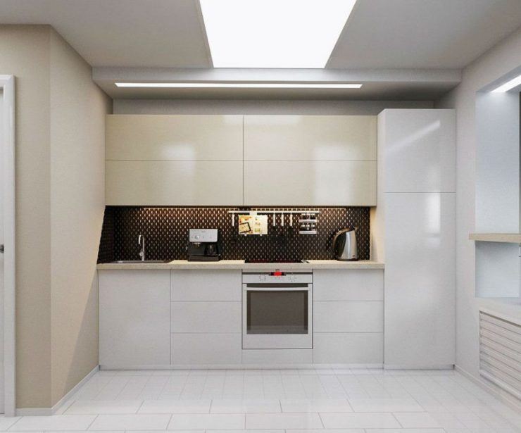 Pour les petits espaces et les espaces étroits, un système de planification linéaire est idéal. Pour respecter la "règle du triangle", il est nécessaire de placer un réfrigérateur et un évier des deux côtés du poêle. Dans ce cas, la disposition linéaire sera ergonomique et efficace. La zone de cuisson avec cette planification est très limitée. Un tel placement est le seul possible pour les petites cuisines.