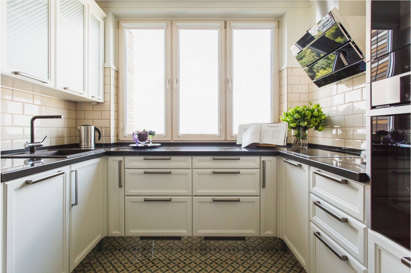 Ce type de planification spacieux et pratique convient aux cuisines de grande et moyenne taille. Les éléments du triangle dans ce cas vont très bien. La disposition en forme de U présente plusieurs avantages: la possibilité d'installer un nombre important de systèmes de stockage, d'appareils électroménagers, d'appareils ménagers et de surfaces de travail est située le long de trois murs. Ce système est très difficile à appliquer pour les petites pièces.