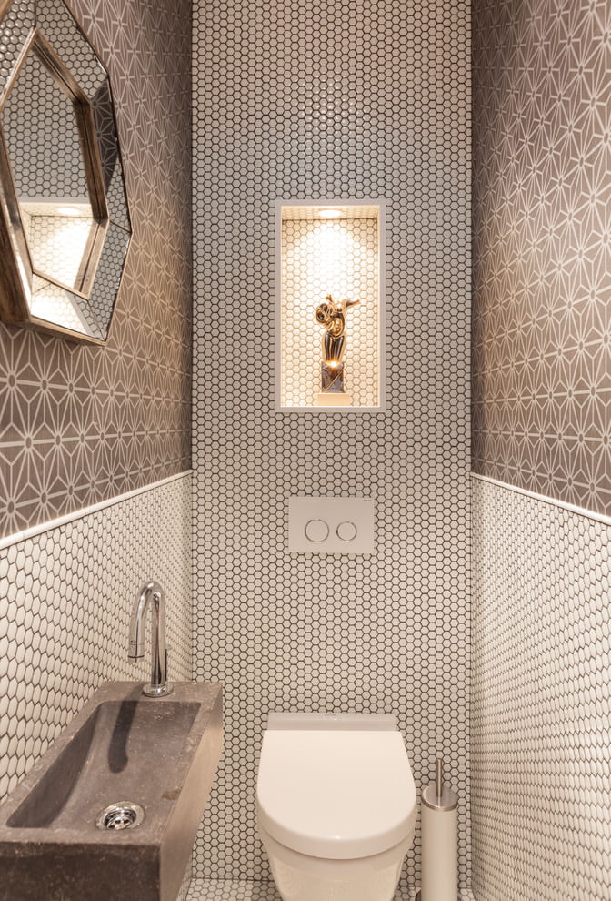 Une bonne option pour concevoir une toilette peut être l’utilisation de plusieurs types de carreaux sur une surface qui diffèrent par la teinte ou la texture. Une combinaison de carreaux «métro» et de carreaux texturés multicolores donnera un aspect brillant dans un petit espace. La mosaïque et les carreaux de céramique se complètent parfaitement.