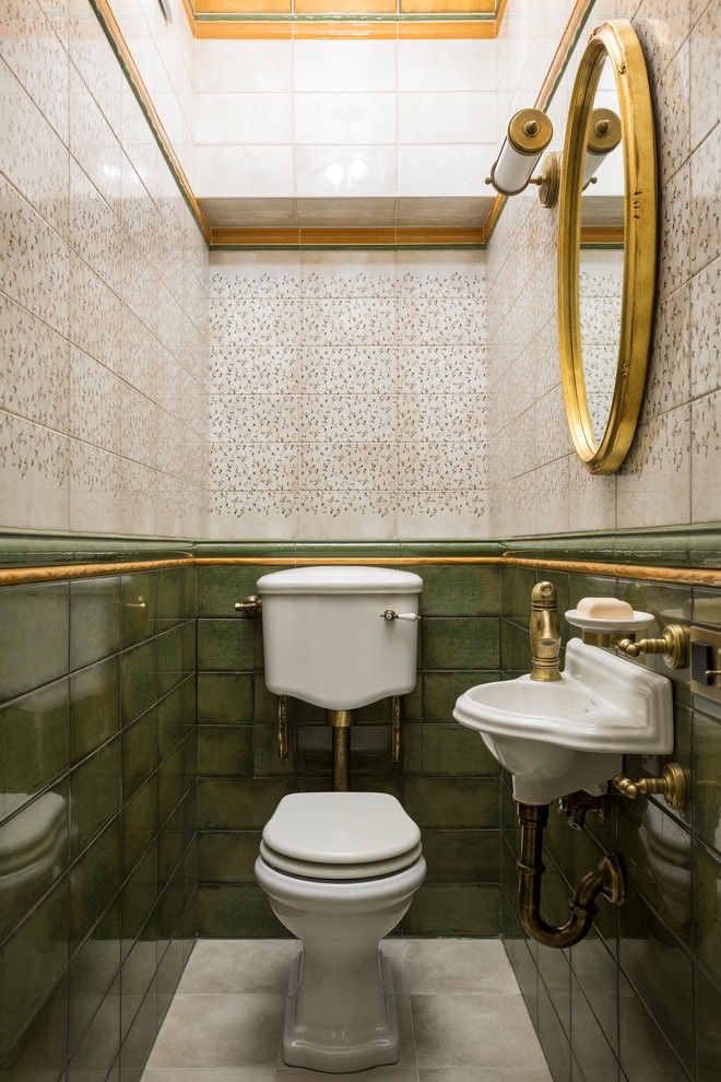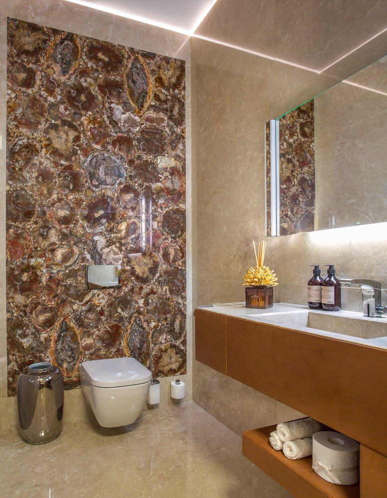 Lorsque vous concevez une toilette de style baroque ou classique, utilisez la doublure murale en perle d’origine. Les meubles en bois foncé ajouteront une couleur noble aux carreaux texturés.