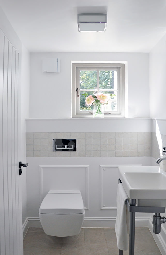 Ceux qui préfèrent le minimalisme dans tout peuvent être conseillés à la décoration murale dans une petite toilette avec des carreaux de porcelaine brillante de taille moyenne.