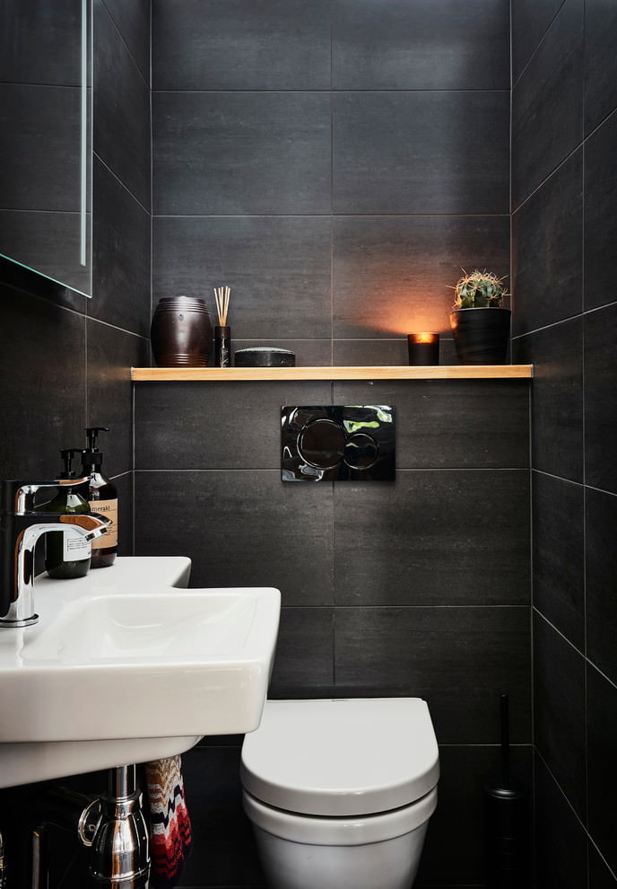 Si les carreaux sombres sont choisis pour la finition d'une petite salle de bain, vous devez vous occuper d'un éclairage de haute qualité. Sinon, être ici ne sera pas confortable.