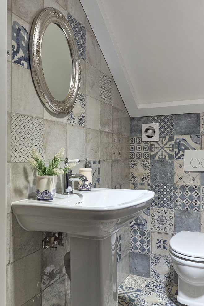L'utilisation d'un matériau de type patchwork est assez coûteuse. De plus, s'il est utilisé pour décorer toute la pièce, il sera trop coloré. Par conséquent, il est choisi pour la conception de zones individuelles, en particulier celles qui sont les plus polluées ou constamment en contact avec de l’eau. Un tel motif coloré rend la salle de bain amusante et facile.