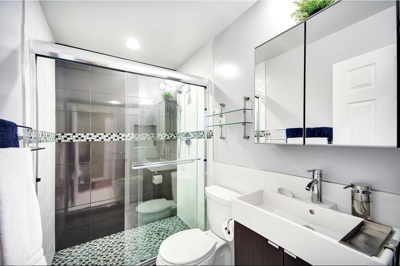 Une mosaïque colorée de couleurs saturées sur un mur d’accent contre un fini blanc et une plomberie brillante. Une petite dalle spectaculaire regarde à côté des dalles brillantes sur le mur adjacent et les surfaces en miroir.