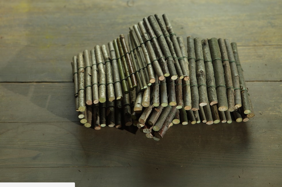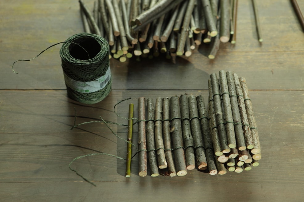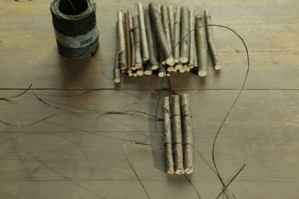 Tout d’abord, coupez les branches pour qu’elles aient la même longueur.Couper deux morceaux de fil, la même longueur. Nous ajoutons chacun d’eux en deux. Entre eux, nous mettons un bâton et faisons un tour de chaque côté. Cela est nécessaire pour le réparer en toute sécurité.