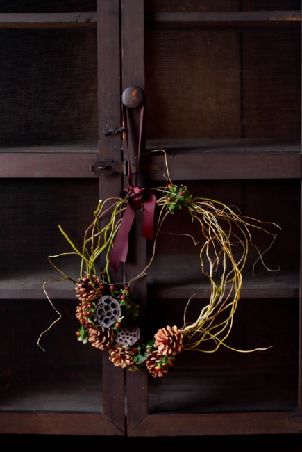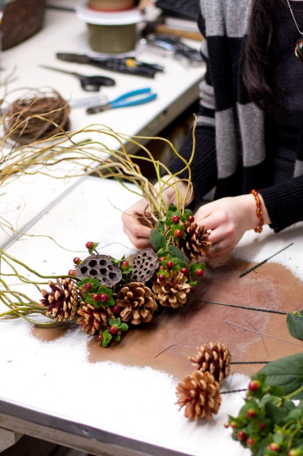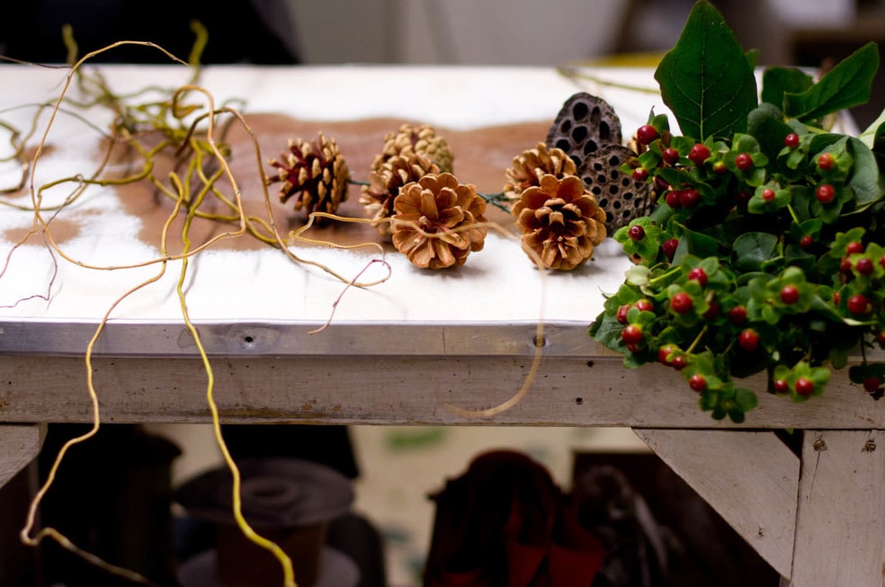 Nous ajoutons des branches d’hypericum et des boîtes de graines de lotus à la composition.