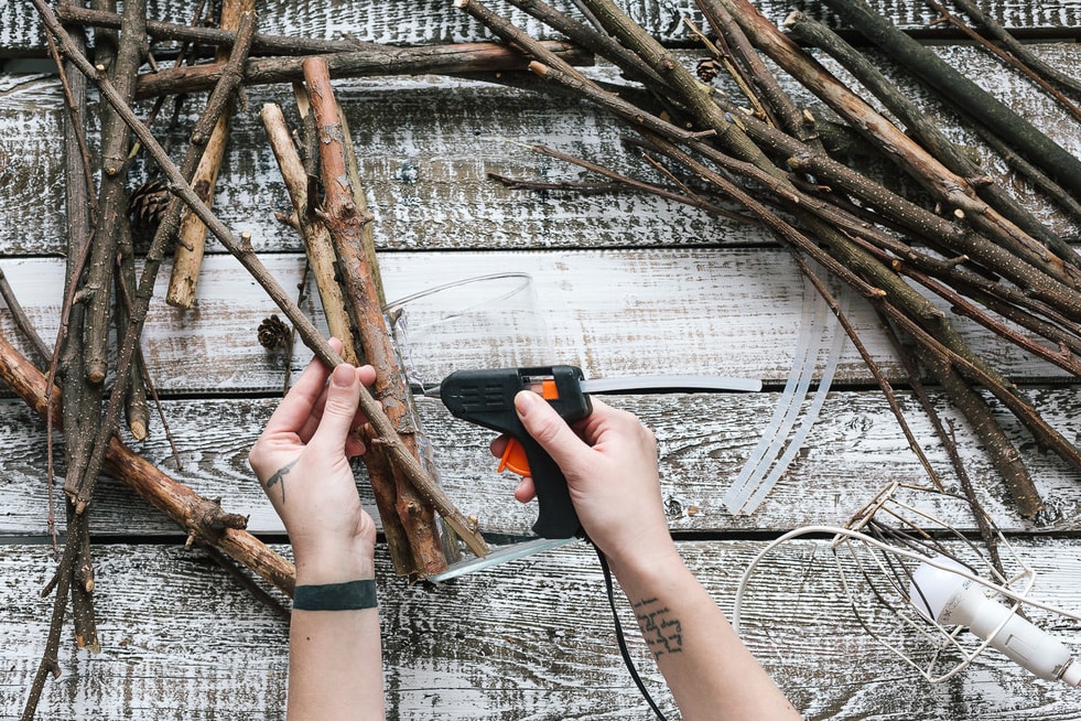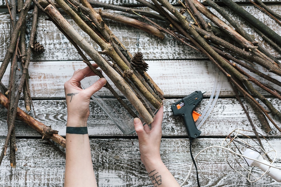 Pour commencer, nous traitons la surface du vase avec de l'alcool. Ensuite, collez doucement les branches sur le vase à l’aide d’un pistolet à colle chaude.