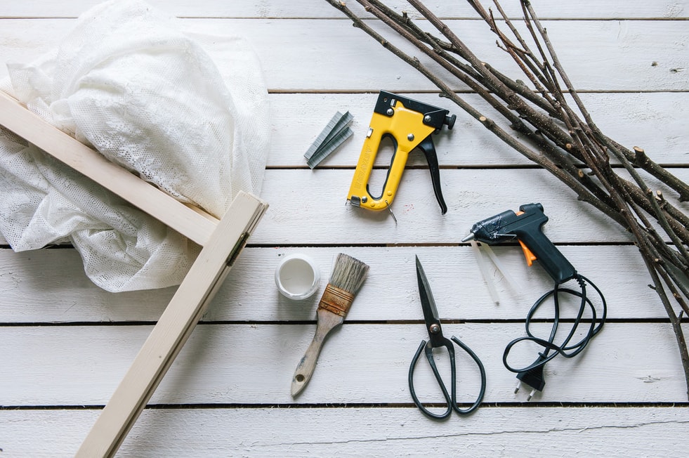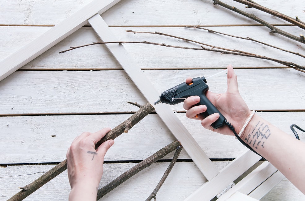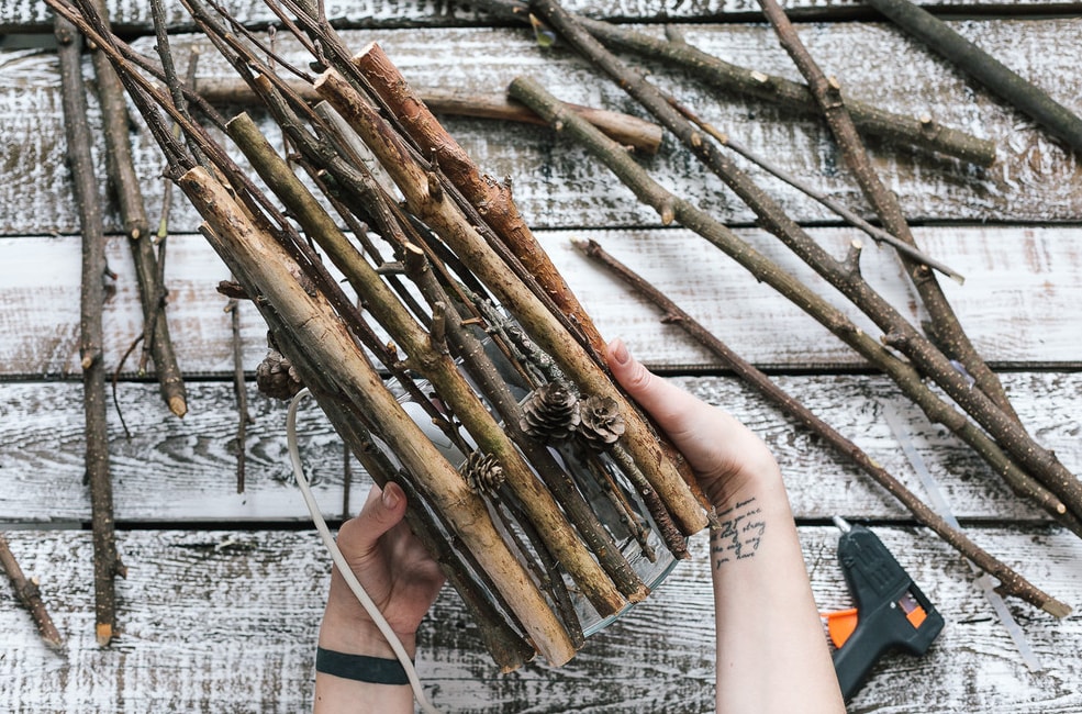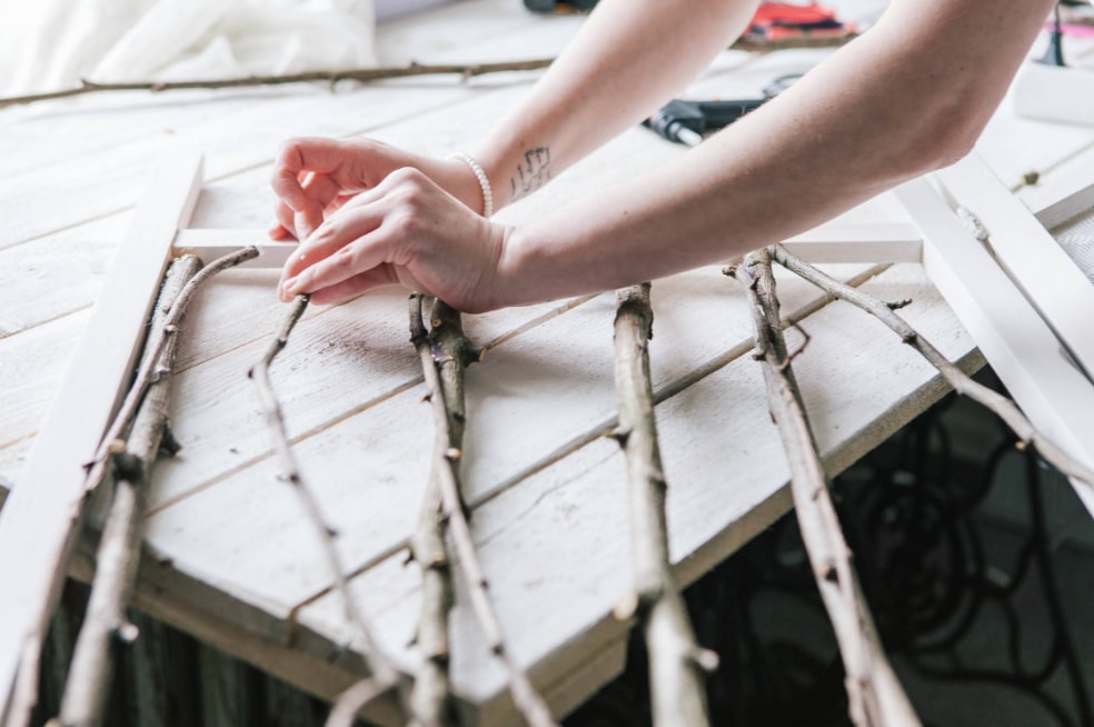 Nous attachons les branches au cadre en bois avec un pistolet à colle.