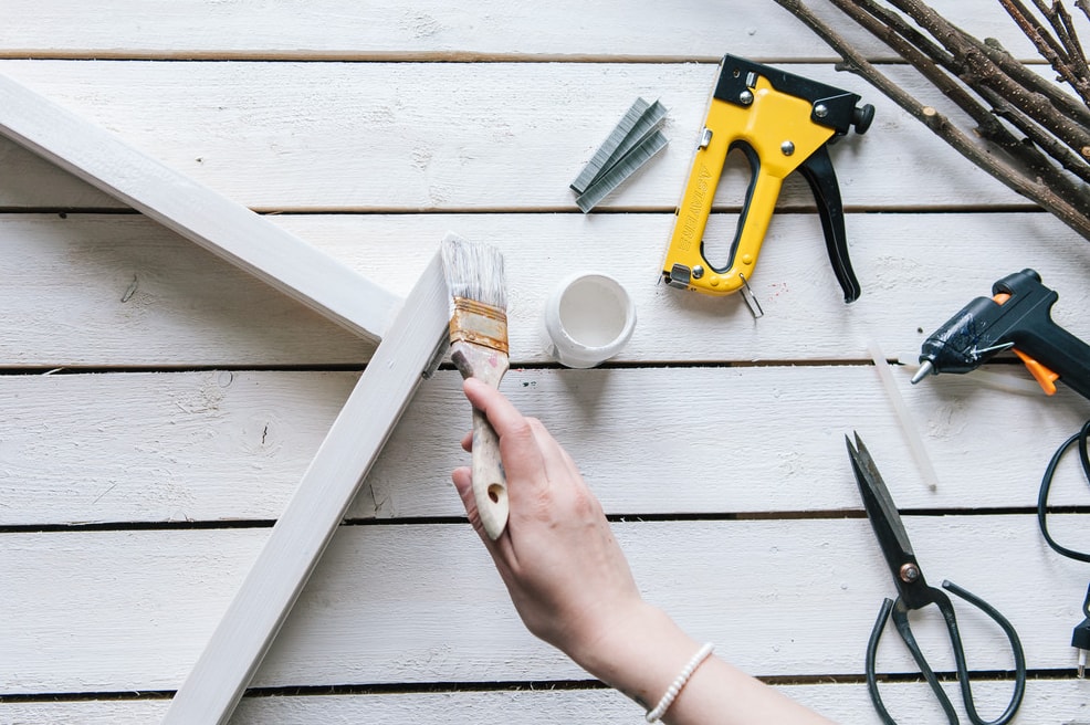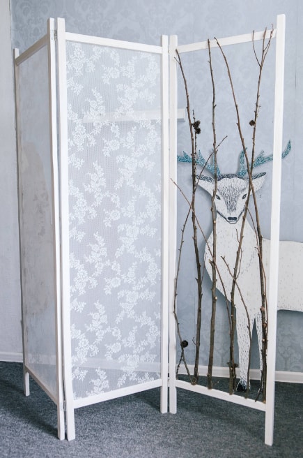 Pour commencer, nous supprimons tout le tissu de l'écran. Nous recouvrons les éléments en bois avec de la peinture acrylique en deux couches. Laissez sécher complètement.