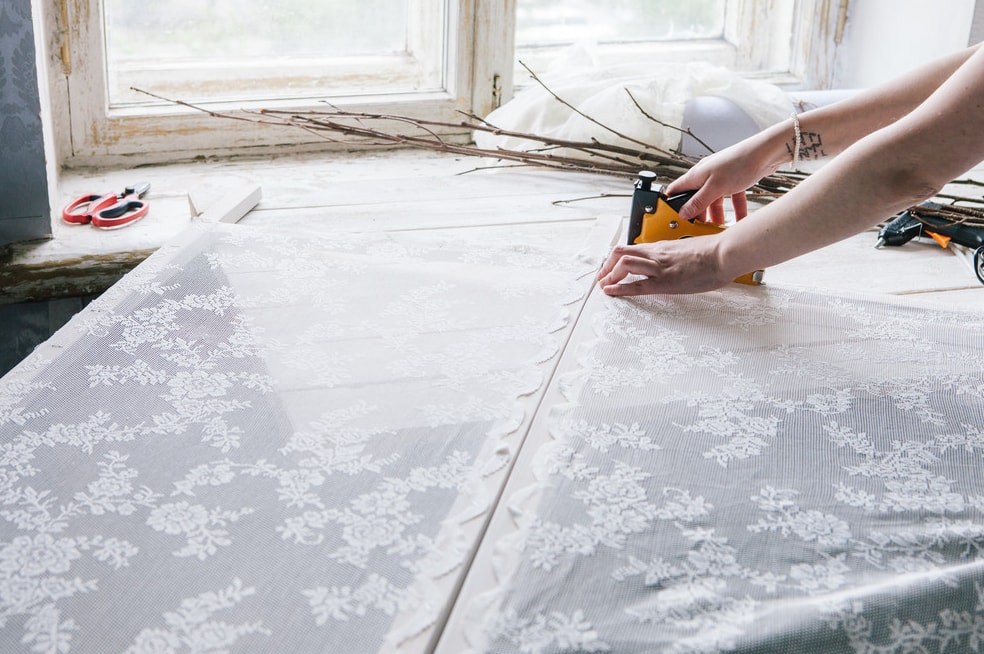 À l’aide d’une agrafeuse, nous fixons un morceau de tissu sur l’écran. Il est très important de le tirer pour qu'il ne s'affaisse pas.