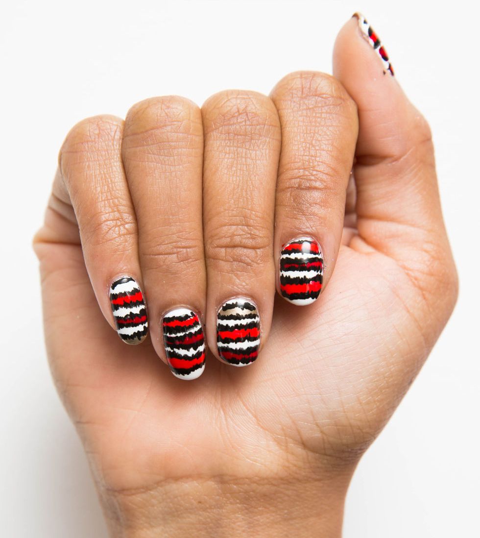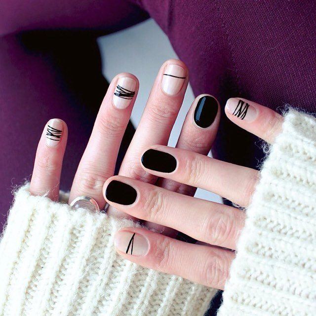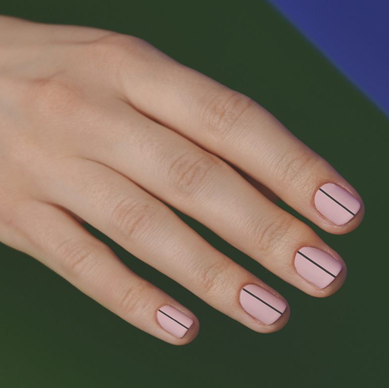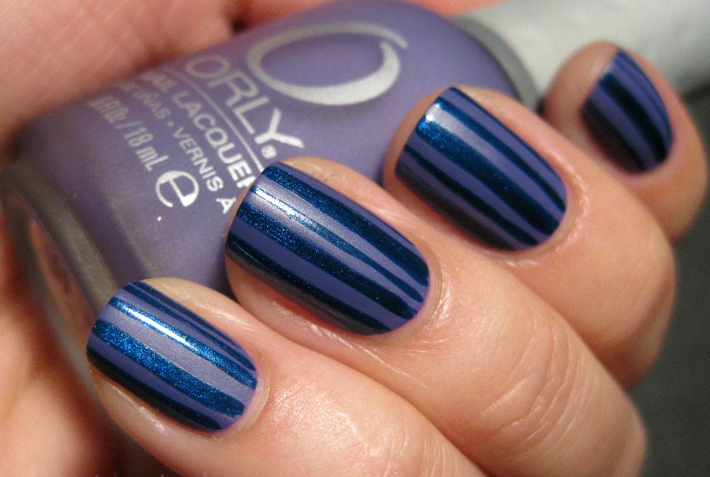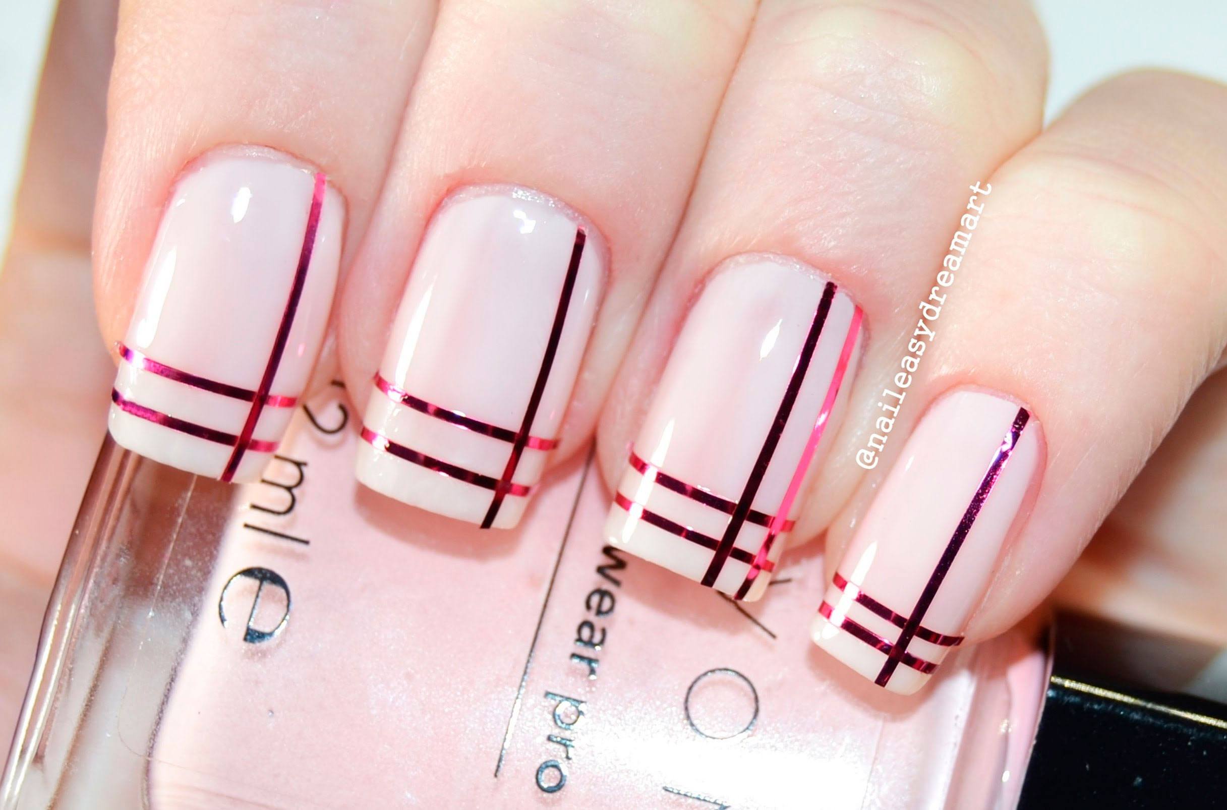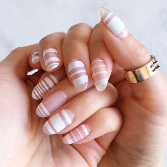 Manucure à rayures utilisant des rayures verticales et horizontales.