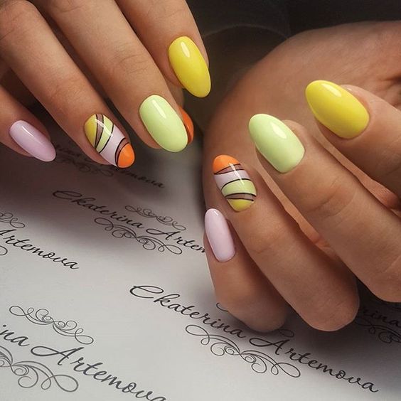 En ce qui concerne les couleurs vives, il est très difficile de s'en passer à la belle saison. Une manucure à rayures en rose, jaune, rouge ou violet aura l’air élégant et lumineux. Chacune de ces nuances, à la fois individuellement et en combinaison avec une couleur différente, est une option appropriée pour créer une manucure à rayures frappante, inhabituelle et lumineuse.