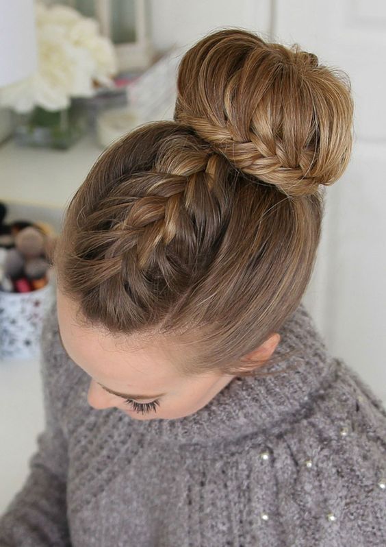 Si vous avez besoin d'une coiffure plus sobre et laconique, nous vous suggérons de faire un chignon. Une simple option ne semble pas trop originale. Pour une coiffure plus moderne, tressez vos cheveux en trois tresses. Puis combinez-les en un et formez un paquet. D'accord, cette option est très jolie.