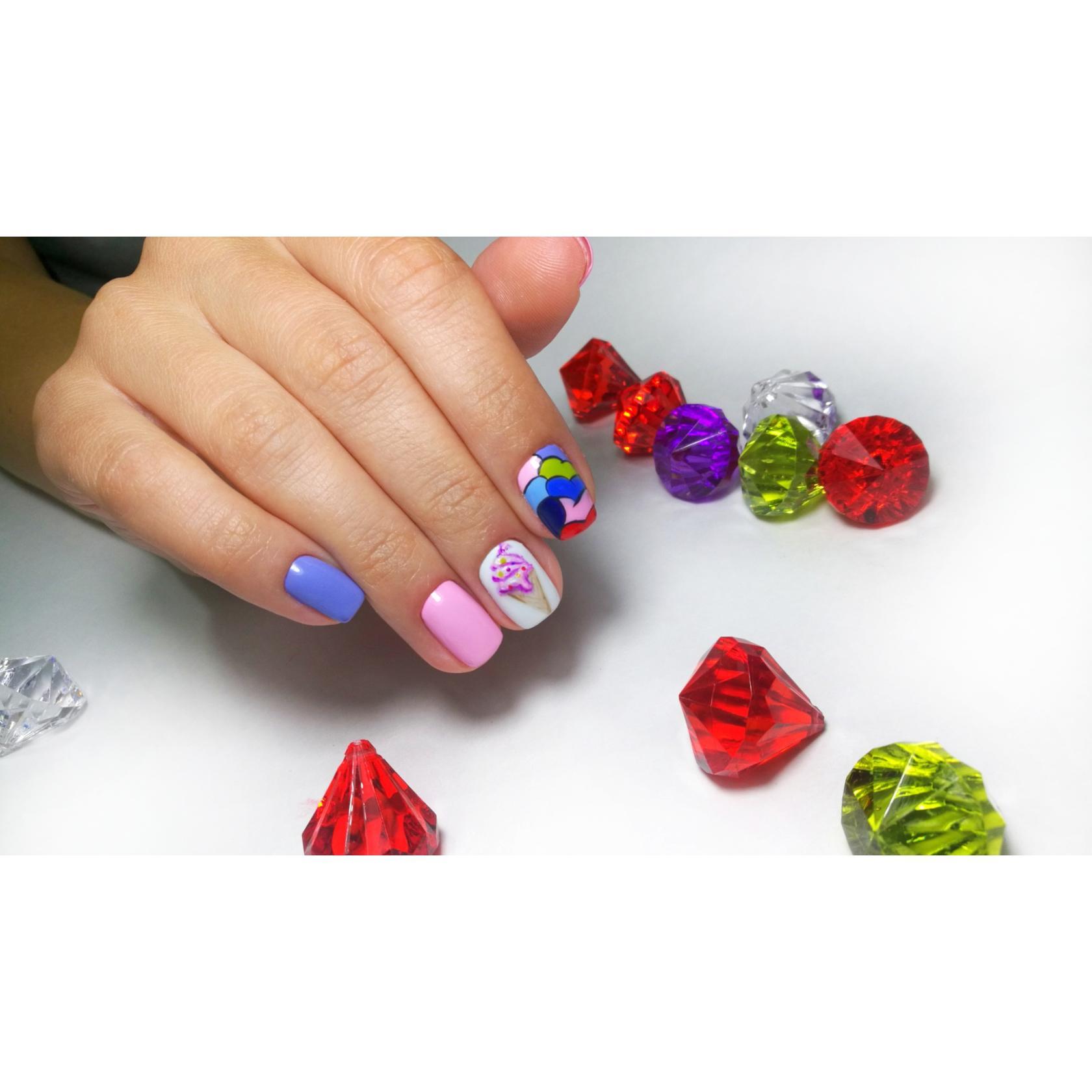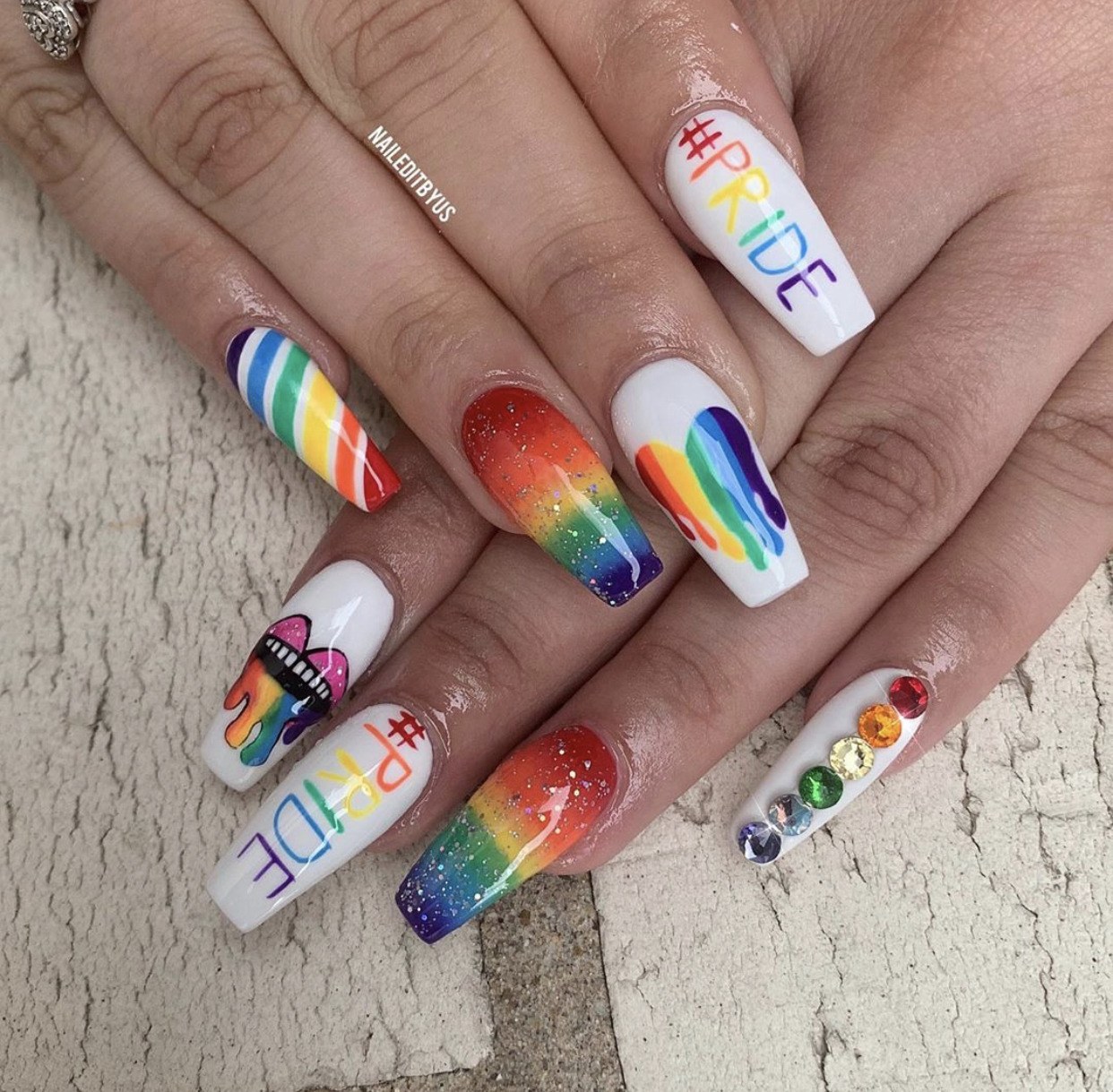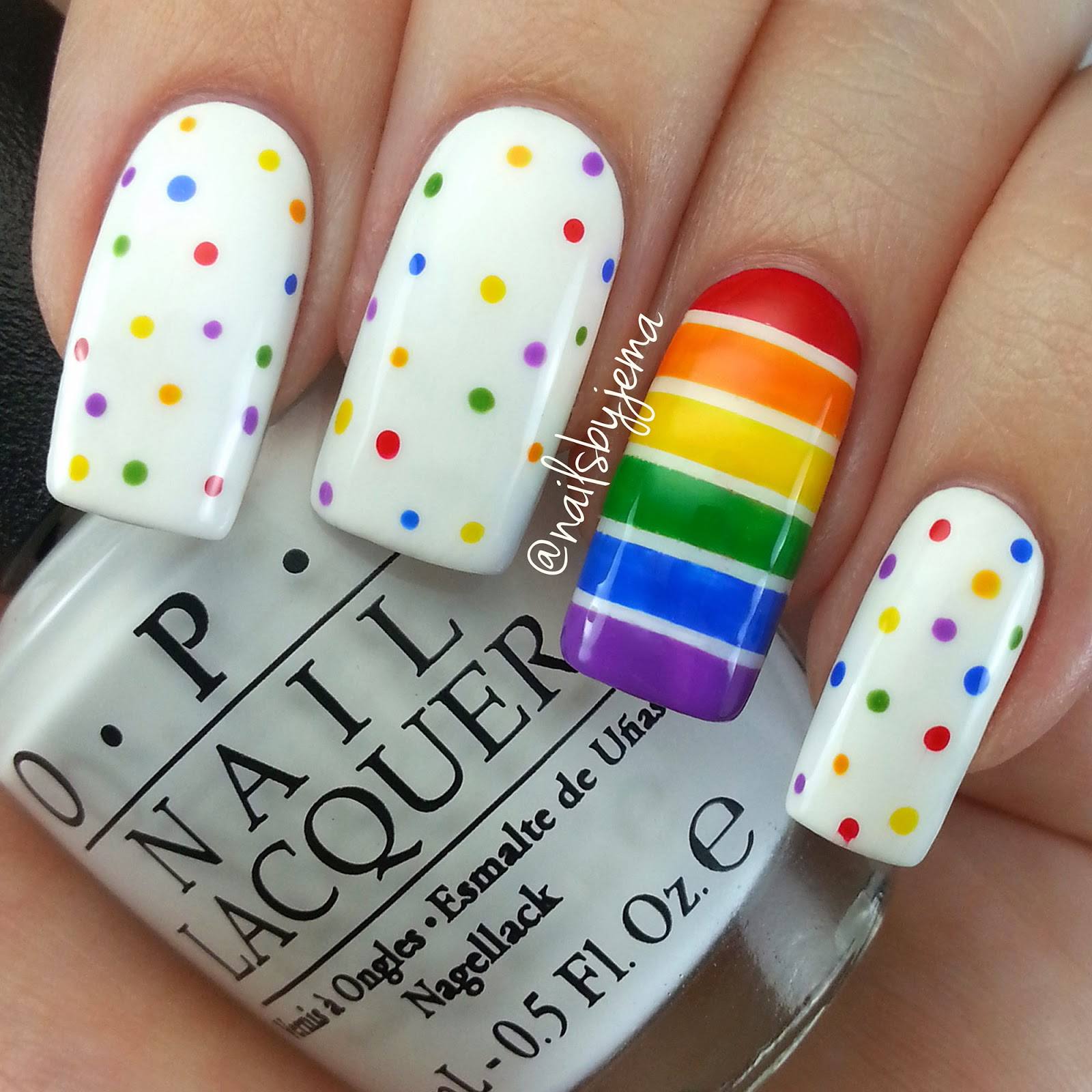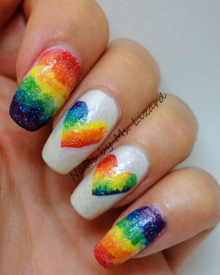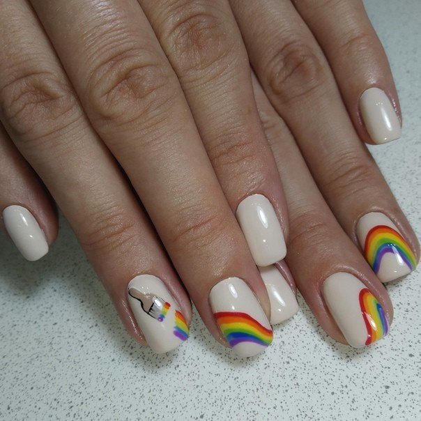 La teinte blanche du revêtement de laque donne une occasion unique d'exécuter n'importe lequel des ornements sur son fond. Par exemple, l'arc-en-ciel va bien avec le contraste de blanc, soulignant ainsi la luminosité et la richesse du dessin. Cela aura l'air génial si presque chaque doigt a une image qui ne contient que quelques éléments de décoration liés aux thèmes de l'arc-en-ciel.