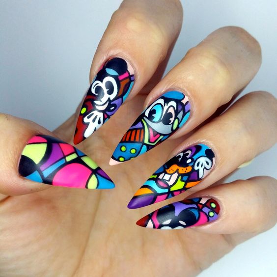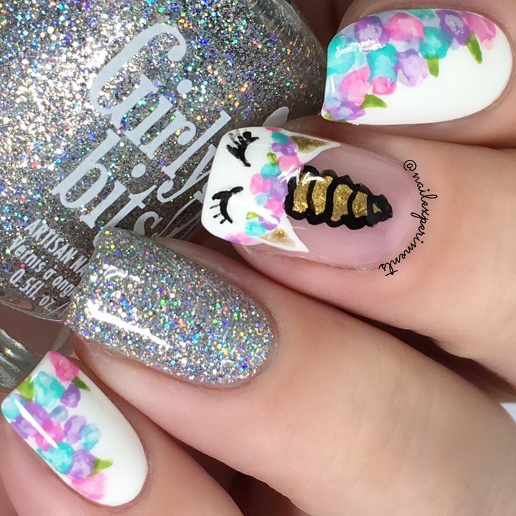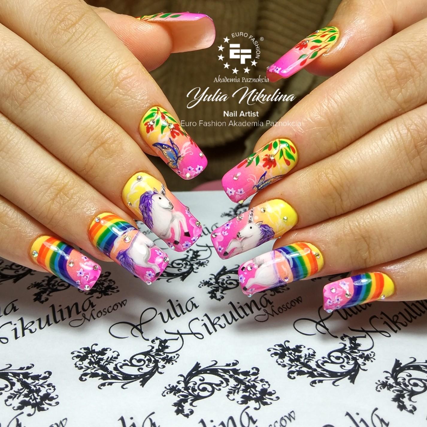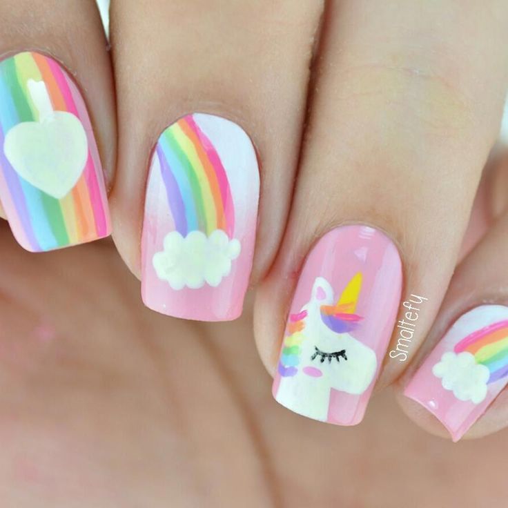 Ce type de manucure semble plutôt inhabituel, mais en même temps intéressant. On trouve le plus souvent un arc-en-ciel et une licorne sur les ongles de représentants de la génération adolescente. Après tout, c'est exactement l'âge où vous voulez quelque chose d'inhabituel et d'extraordinaire. Ainsi, beaucoup de jeunes fashionistas essaient d'attirer l'attention du sexe opposé. La conception d'une manucure arc-en-ciel ne comporte que quelques images d'une licorne. Il s'applique principalement à un ou deux clous. Créature mystérieuse réalisée dans un style de bande dessinée. Sur certaines plaques à ongles, un ornement en forme d'arc-en-ciel brillant est appliqué. Un complément à ce modèle peut servir de plusieurs ornements sous forme d'étoiles, de bonbons ou de nuages.