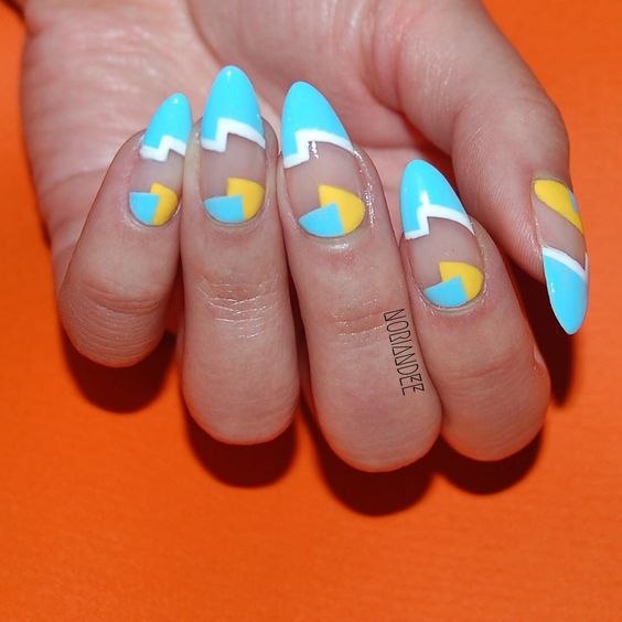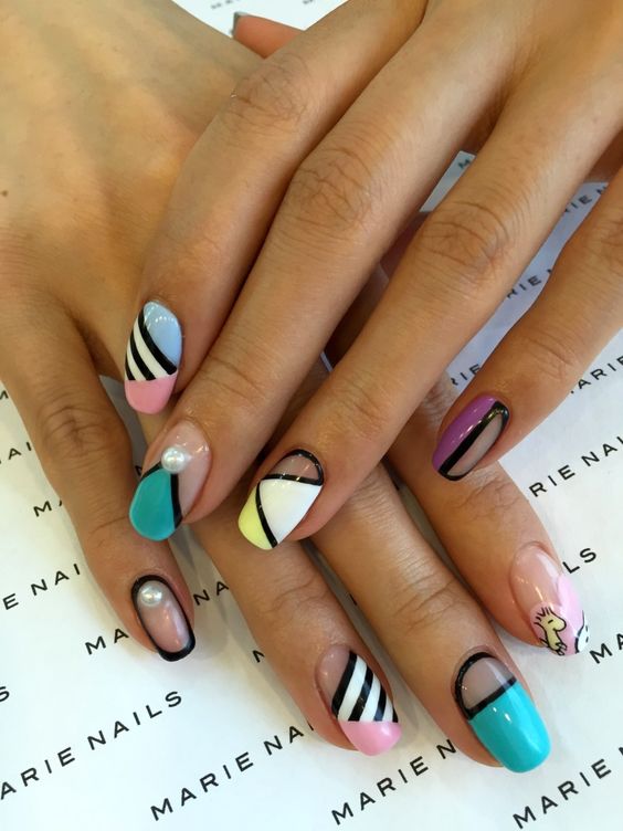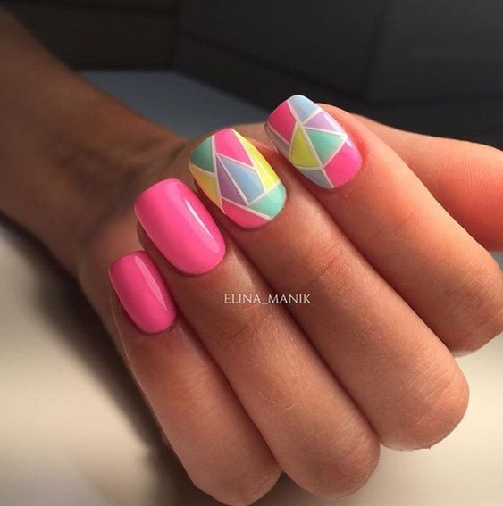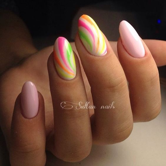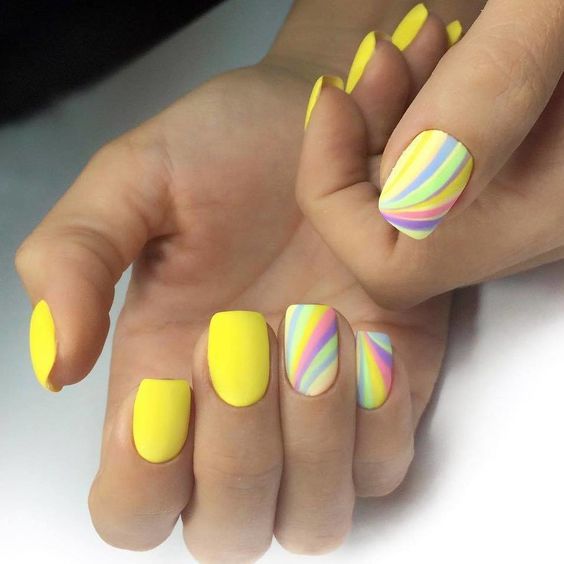 La couleur pastel de ce type de manucure peut constituer l’arrière-plan principal du revêtement de vernis. Par exemple, tous les ongles sont recouverts d'une teinte pastel et décorés de petites étincelles. Juste l'anneau et le majeur auront plusieurs images de l'arc-en-ciel, situées dans des directions différentes. Cette option n'est pas trop intrusive et soignée en apparence.