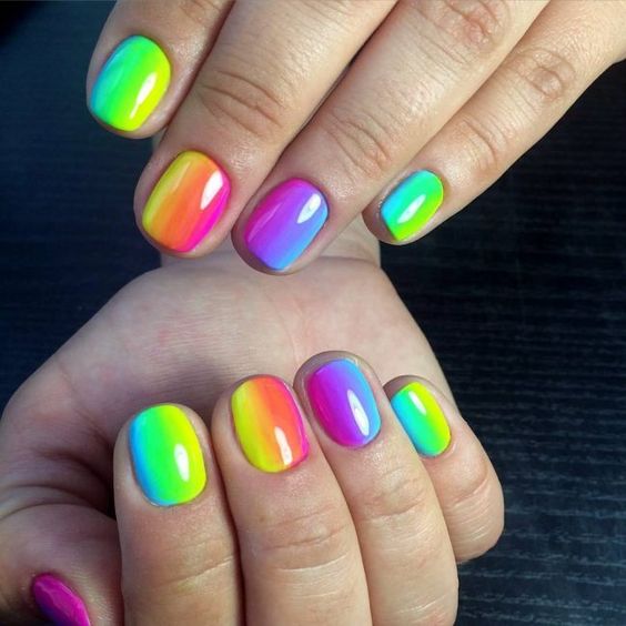 Il se trouve que les ongles courts peuvent avoir non seulement une ou deux teintes de vernis, mais aussi être décorés de toutes les couleurs de l'arc-en-ciel. Cette option peut servir d’ombre, lorsque deux ou même trois teintes de vernis ne se confondent en un tout. Et toutes les couleurs de l'arc-en-ciel. Sur les ongles courts, les lignes fines des nuances irisées qui se fondent harmonieusement vers les doigts voisins ont l’air original. Ainsi, si vous vous croisez les doigts, vous obtenez une vague de l'arc-en-ciel.