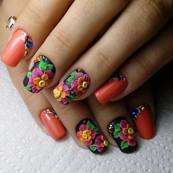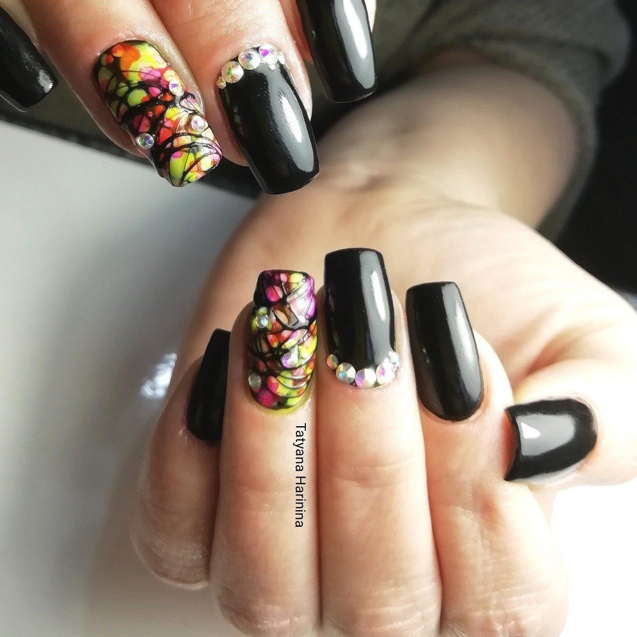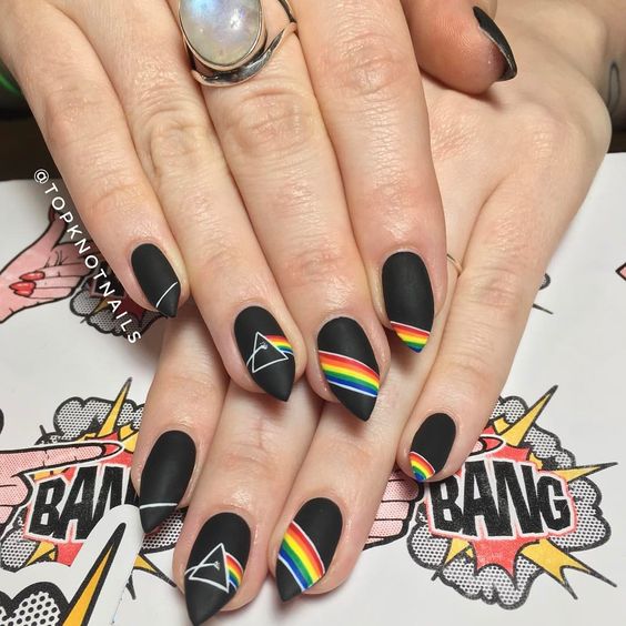 Un ornement arc-en-ciel peut décorer les nuances les plus sombres du vernis. Un exemple est le vernis noir. Cette version de manucure semble assez contrastante et originale. De plus, cette conception est capable de transmettre toute l’ambiance féminine. Supposons que la vie quotidienne sombre et grise se transforme en jours clairs et ensoleillés. C'est ce style de manucure qui convient parfaitement aux fêtes.
