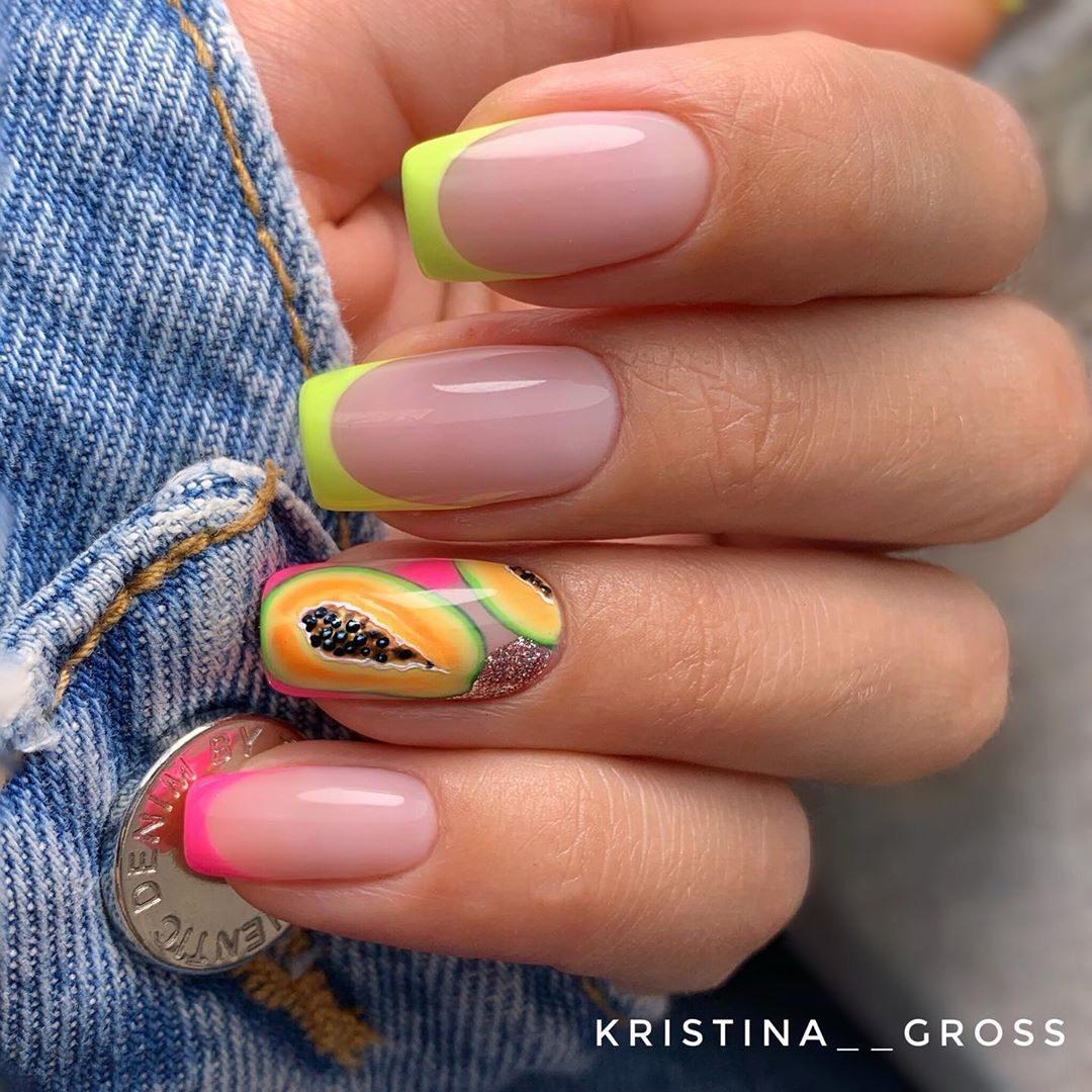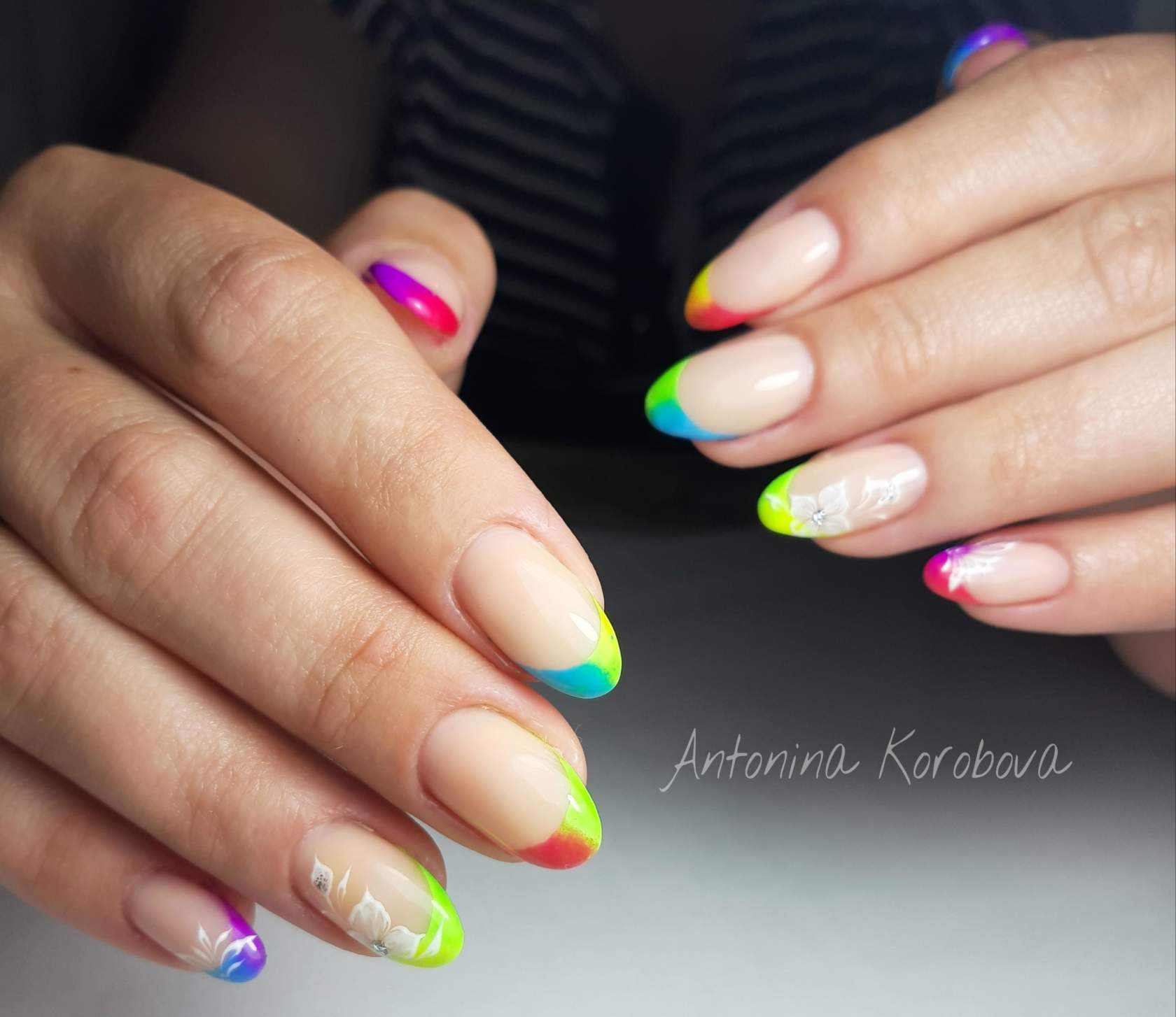 French Manicure est considéré comme un type très pratique et polyvalent de conception des ongles féminins. De plus, le monde moderne de la mode préfère la présenter non seulement dans le style classique, mais même dans des couleurs vives. Ainsi, les manucuristes modernes ont très souvent commencé à utiliser le décor de la ligne du sourire sous la forme d’un arc-en-ciel.Cette option de manucure est parfaite pour se détendre au bord de la mer.