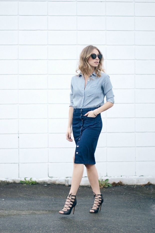 Pour les amateurs de tenues plus féminines, nous suggérons d'associer une jupe en jean avec un chemisier ou un t-shirt léger et des chaussures à talons hauts. Il peut s’agir de bateaux classiques, de sandales à lacets ou même de mules, qui sont maintenant au sommet de leur popularité.
