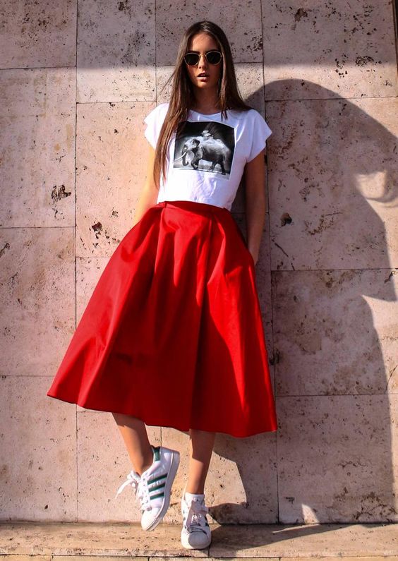 Quant aux baskets, elles sont très intéressantes avec les jupes midi. L'essentiel est de choisir une paire parfaitement adaptée à la couleur et à la forme. Alors l'image sera harmonieuse. L'option la plus populaire et la plus simple est la chaussure blanche. Ils sont universels, vous pouvez donc les combiner facilement avec une variété d’images.