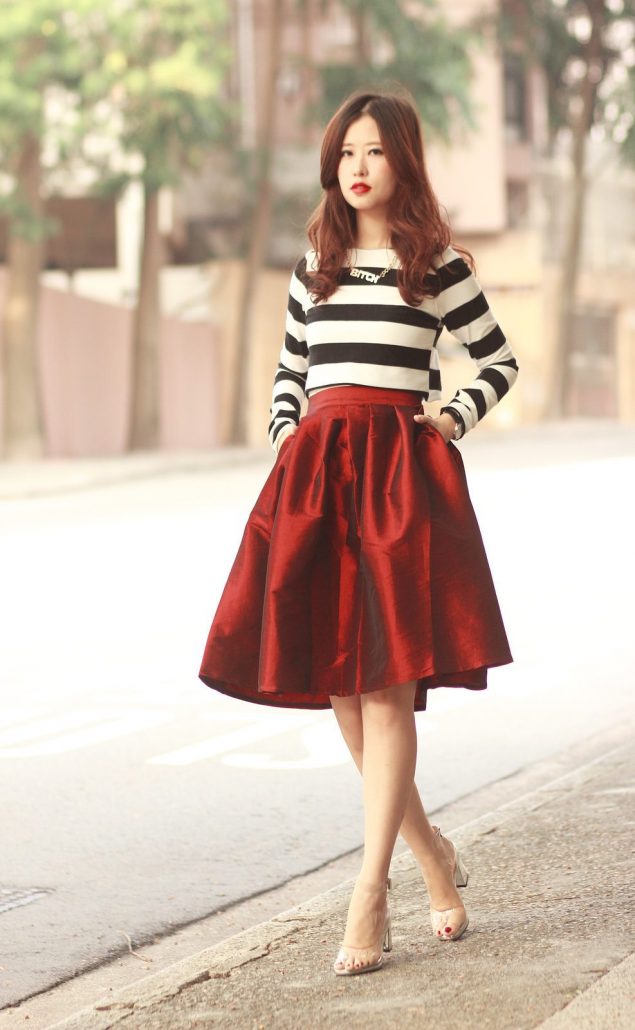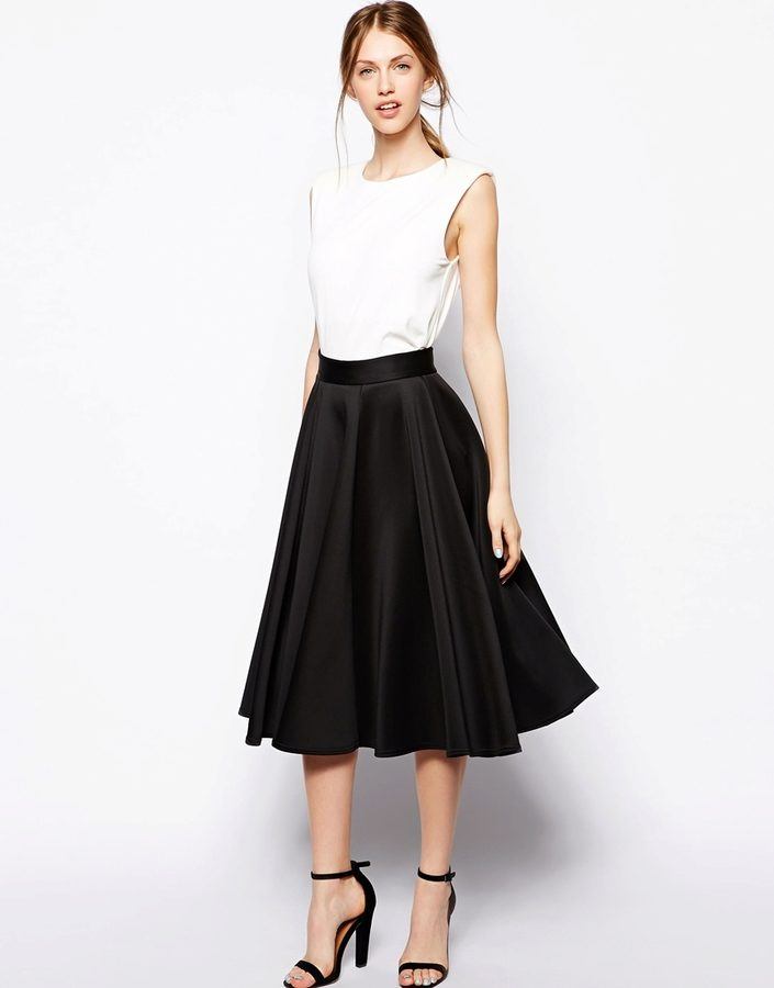 En combinant une jupe pare-soleil avec un haut et des chaussures à talons aiguilles, vous obtiendrez un ensemble spectaculaire spectaculaire. Dans ce cas, il est préférable de choisir un haut en satin, en soie ou en dentelle.