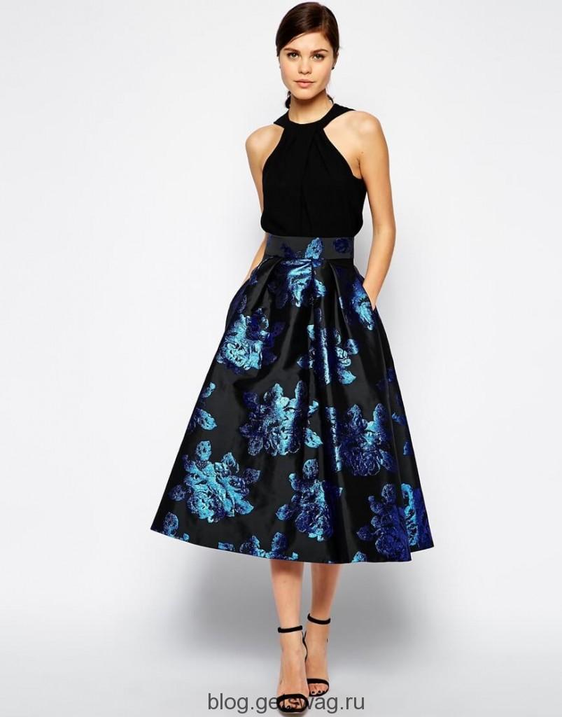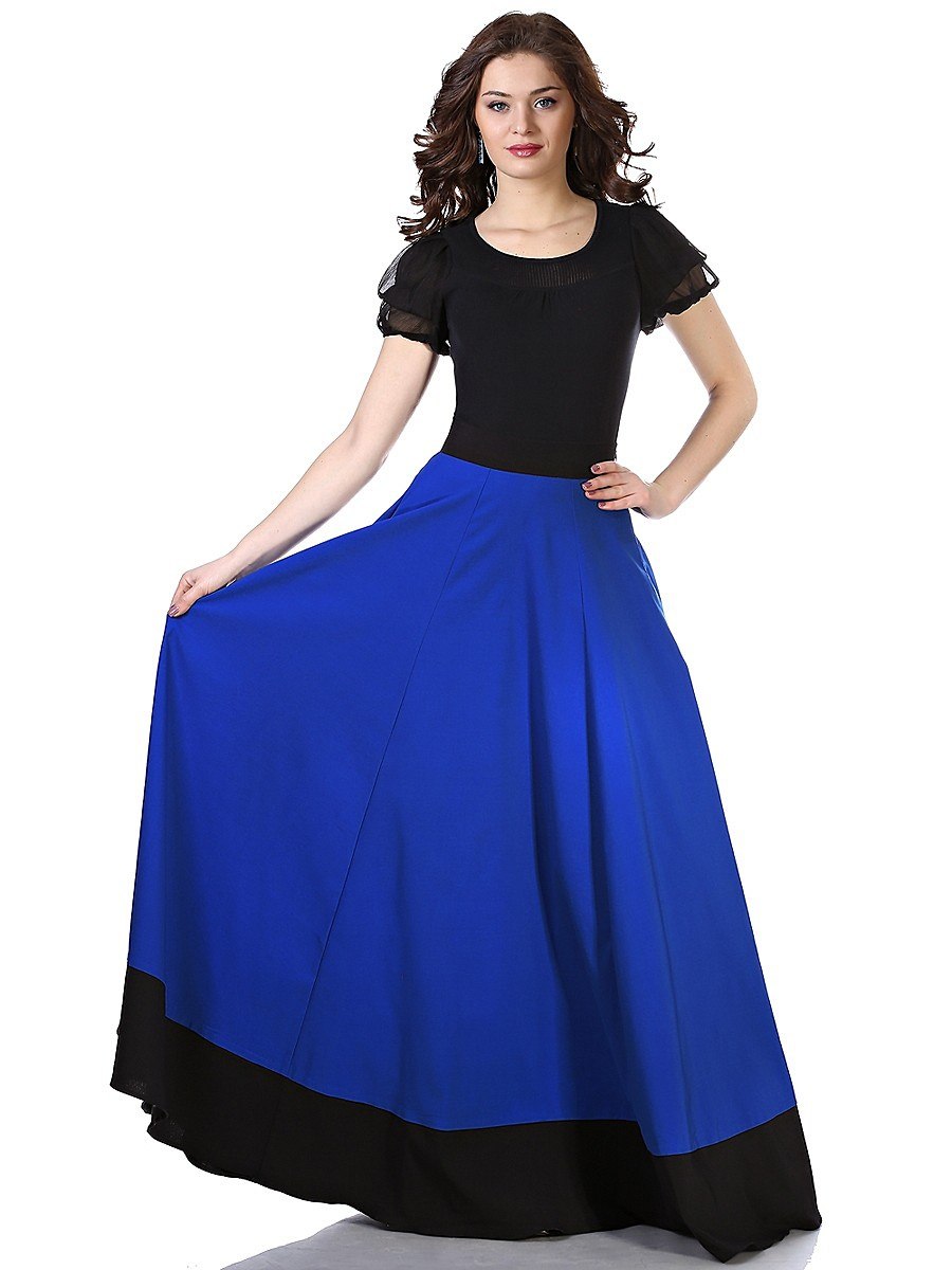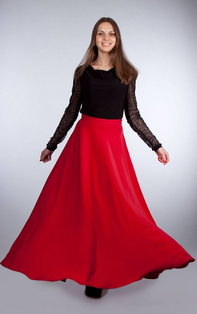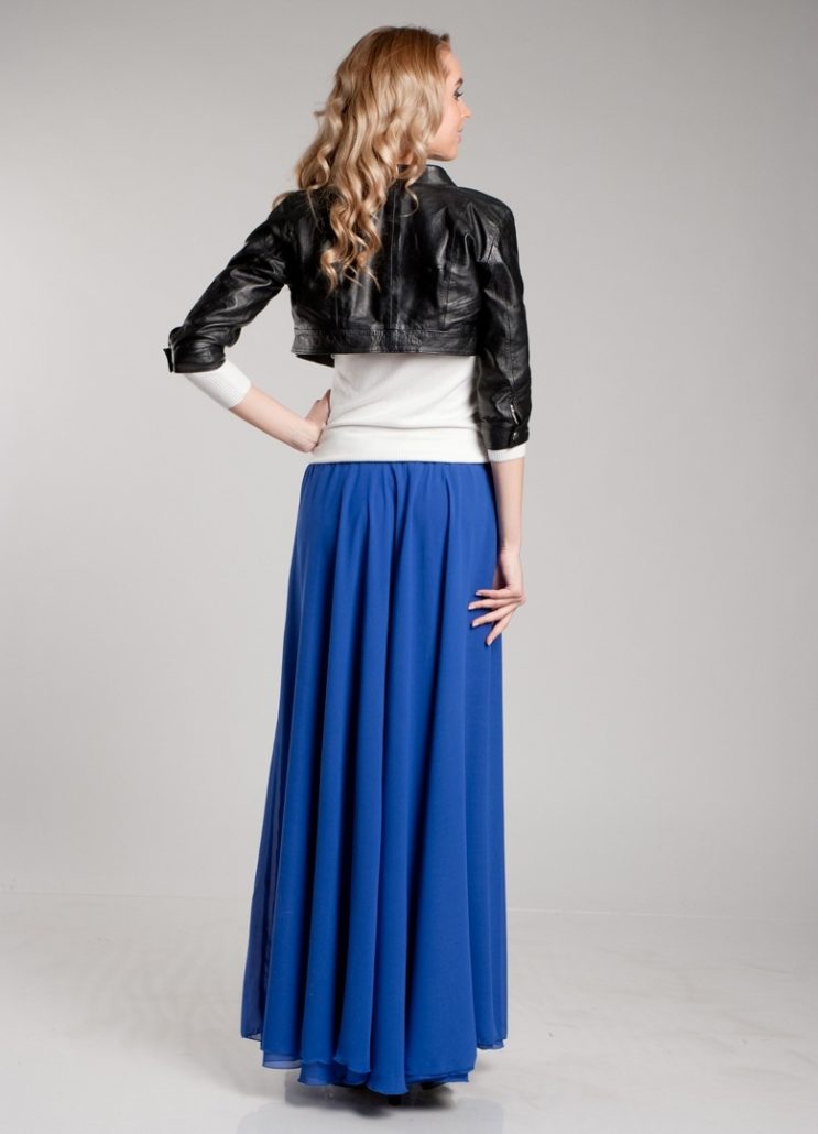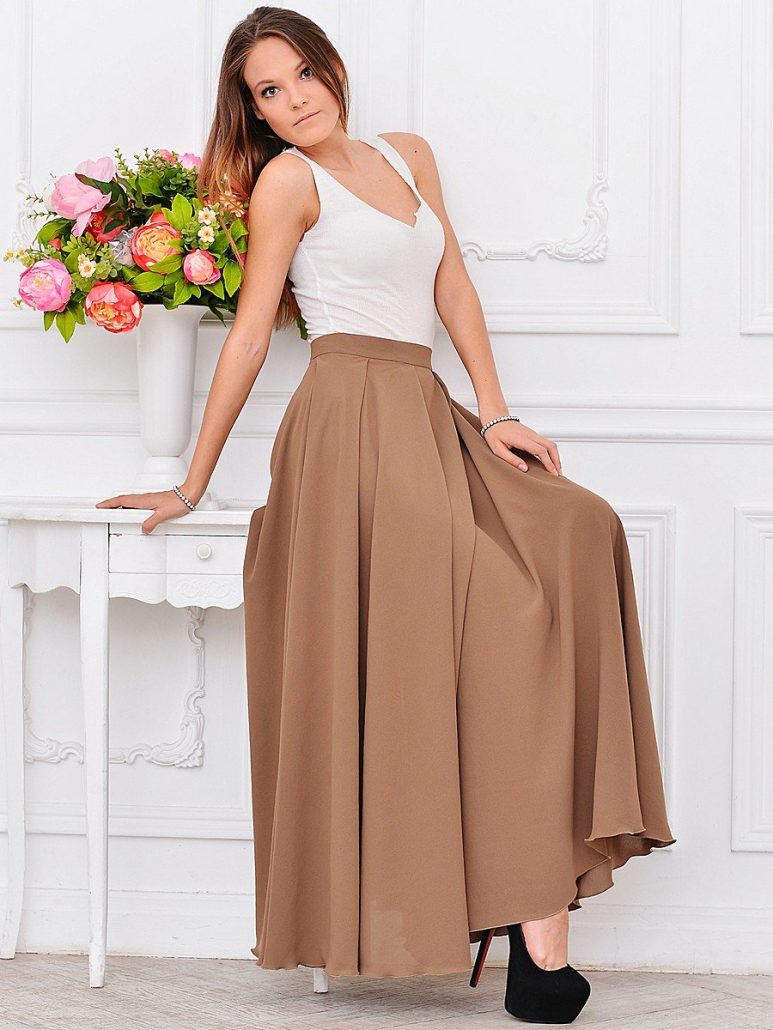 La jupe-soleil sur le sol est très féminine et élégante. Les modèles de tissus légers et fluides seront recherchés en été et les tissus denses aux teintes discrètes pourront être portés en hiver. Un tel modèle sera particulièrement impressionnant pour les femmes de grande taille. Il est conseillé aux petites filles de le porter avec des chaussures compensées ou des talons hauts.