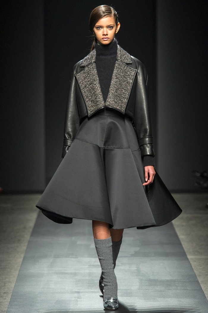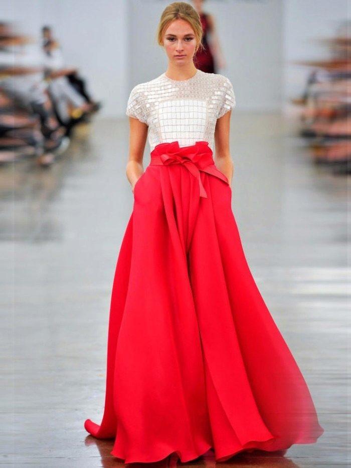 Pour les filles avec un «triangle inversé», un modèle avec de nombreux plis de la taille est plus approprié. Une telle jupe rendra la silhouette plus féminine en ajustant les proportions de la silhouette.