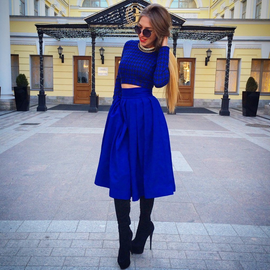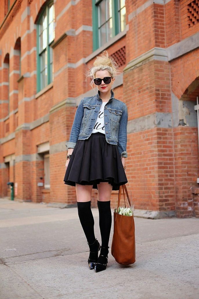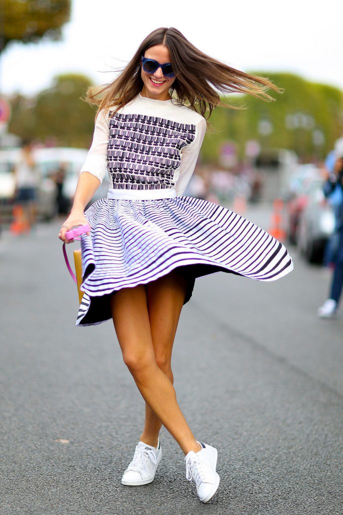 Aujourd'hui, vous ne surprendrez personne avec une combinaison de styles différents. Par conséquent, la jupe-soleil peut bien paraître à la fois classique et chaussures de sport. De plus, l’essentiel est que l’image globale soit globale.