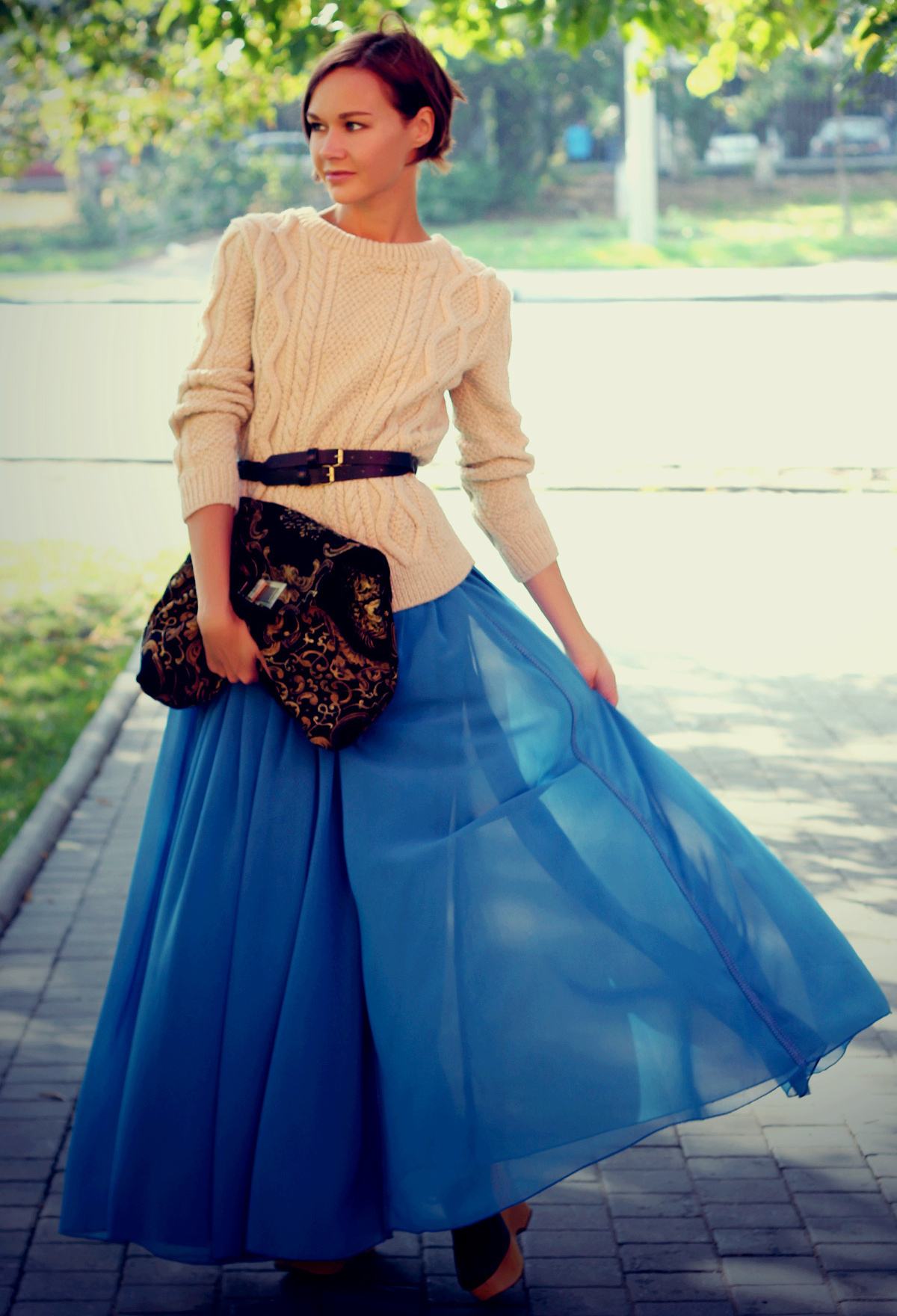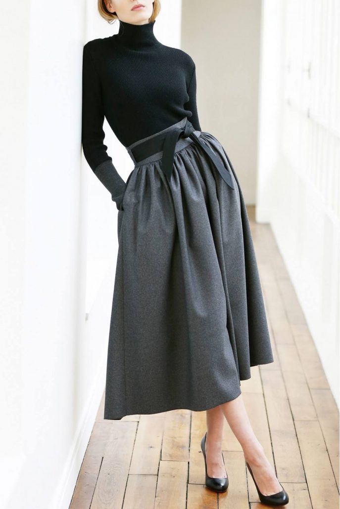 Pour l'hiver, vous pouvez choisir une jupe en laine. Elle a l'air impressionnant avec un pull épais, des collants et des chaussures basses. Une jupe de sol, qui peut être combinée avec un pull à col roulé ou un pull en laine, est également utile pendant la saison froide.