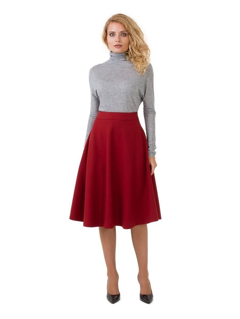 Le jupe-soleil s'harmonise avec succès avec des pulls minces et des pulls volumineux. Dans le même temps, il est intéressant de noter que le tricotage grossier sur un chandail sera meilleur avec une jupe de longueur moyenne et des chaussures à talons hauts. Le haut rayé se marie bien avec un bas uni.