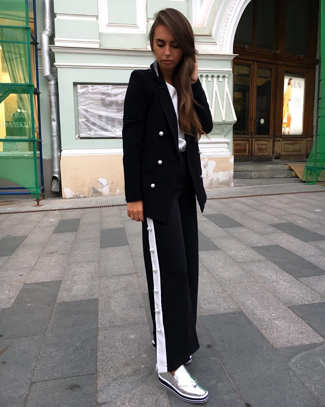 Les versions les plus difficiles des bandes aujourd'hui sont des pantalons au son sportif. Habituellement, ces pantalons ont une combinaison de couleurs très sportive. Mais ne confondez pas le pantalon avec des rayures de style sportif avec un pantalon de survêtement à rayures. Ce sont absolument deux choses différentes. Les pantalons pour femmes à rayures de style sportif sont privés de problèmes en dehors du terrain de sport. Dans ces versions modernes, les concepteurs n’ont pas utilisé de logos, d’éléments décoratifs susceptibles de mettre l’accent sur la vitesse. Mais elles ont une géométrie de podium à laquelle beaucoup de femmes sont habituées, et non la géométrie d’un vêtement de sport. Les femmes qui choisiront un pantalon à rayures avec des notes de sportivité en 2026 auront l’air élégant, à la mode, moderne et cohérent avec les tendances de la mode en 2026.