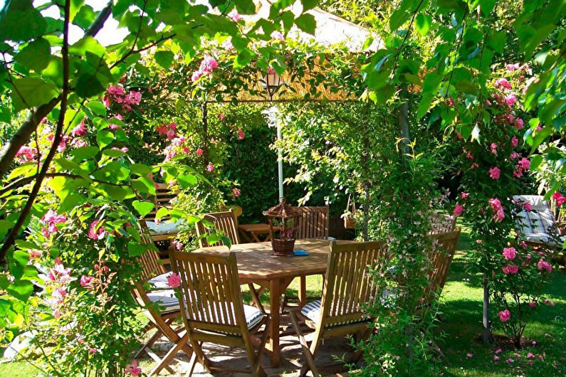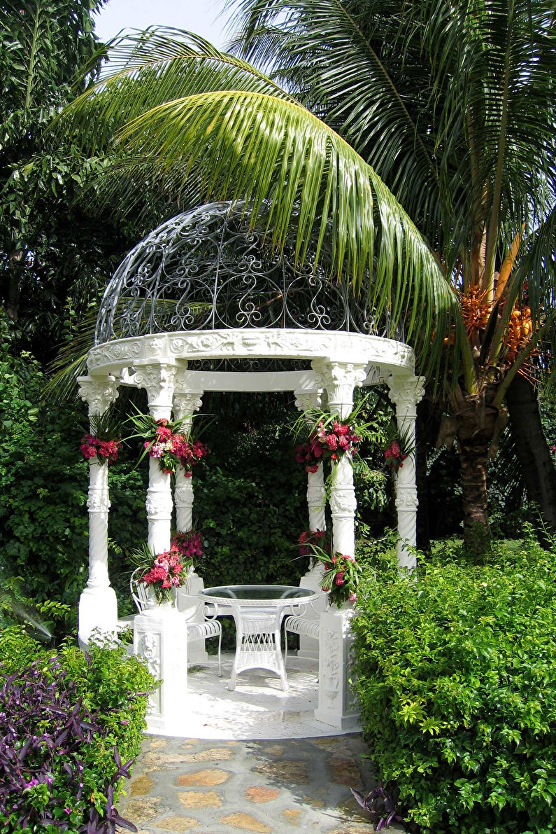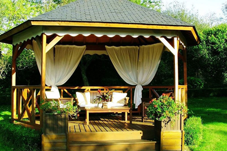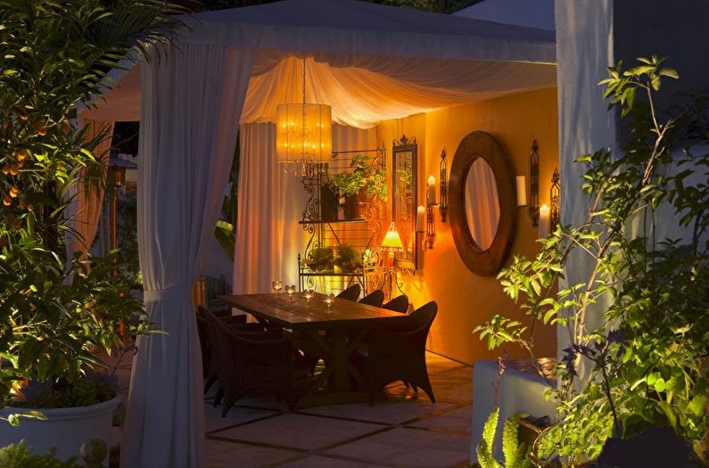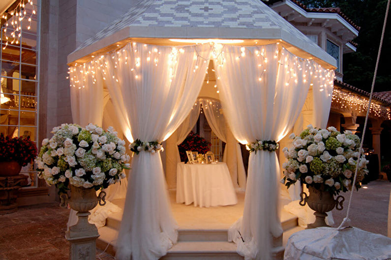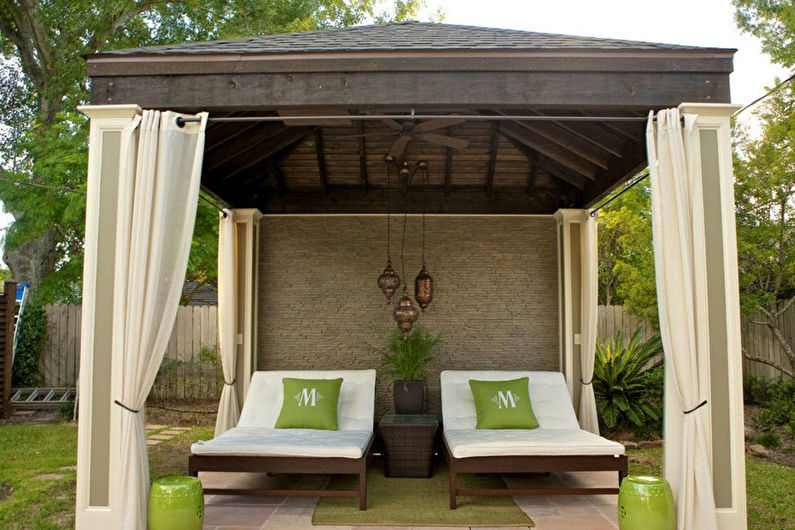 Un tel gazebo peut être décoré avec des bougies, une guirlande, des lumières tamisées, ce qui, en plus de créer une atmosphère romantique le soir, servira de source d'éclairage artificiel.