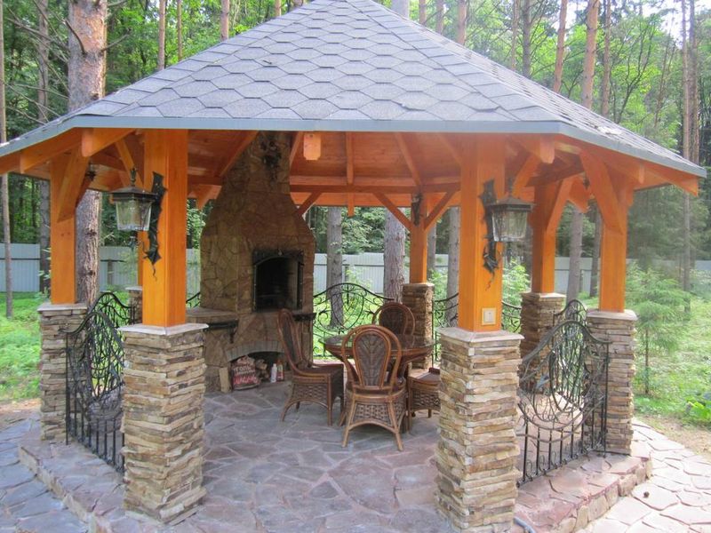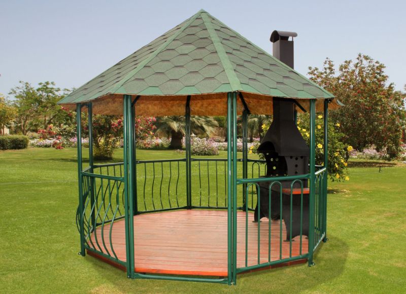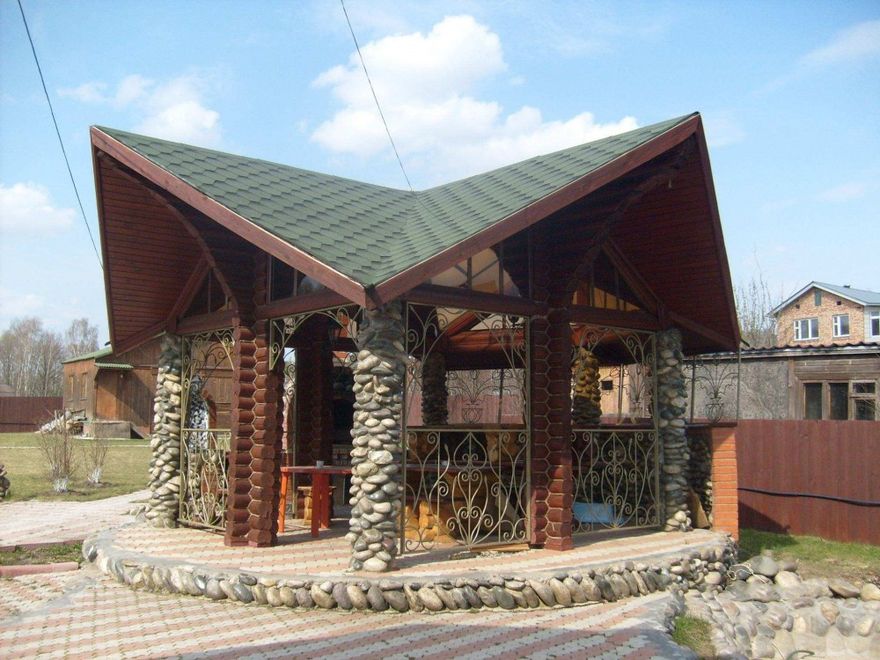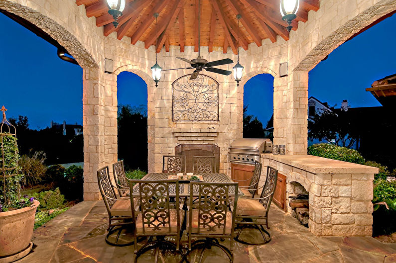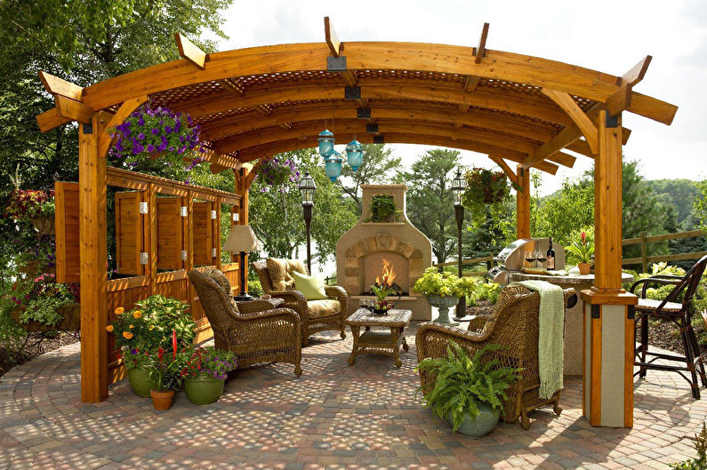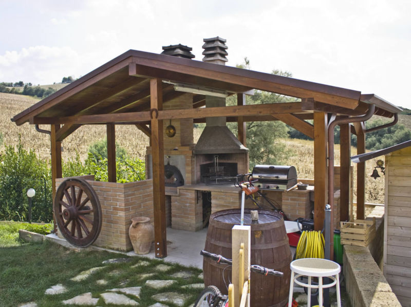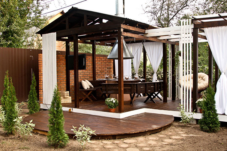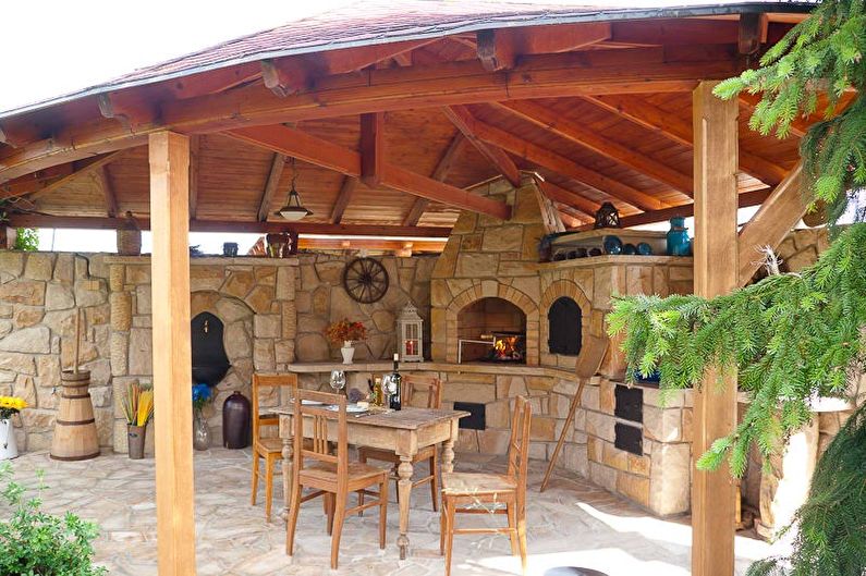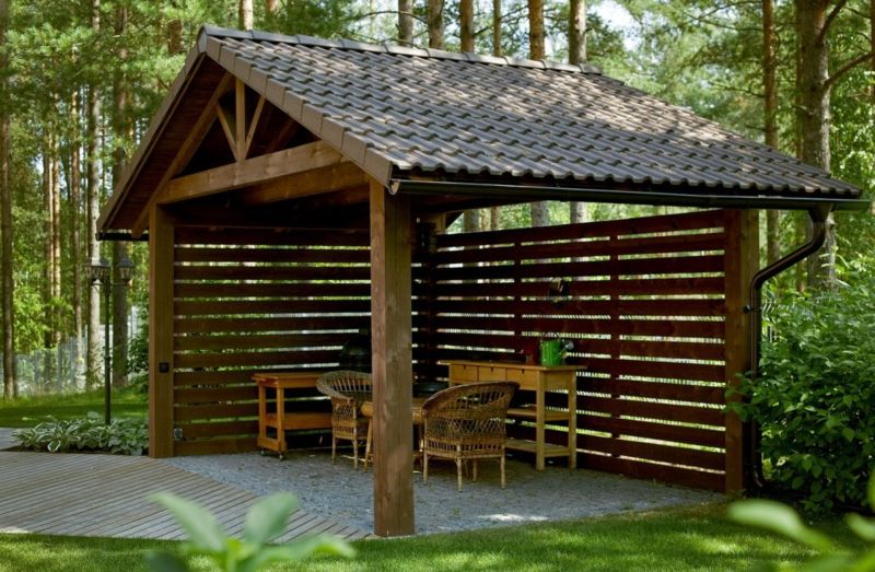 Vous pouvez faire une sorte de verrière. Mais si vous faites déjà des efforts, il est préférable de créer un kiosque de jardin dans lequel vous pourrez facilement préparer vos repas. La construction doit être de type semi-fermé ou ouvert. Lorsque vous organisez un barbecue, un gril ou un barbecue, vous devez tout d’abord veiller à la sécurité incendie, ainsi qu’à un lieu de stockage du bois de chauffage, du charbon, de la vaisselle et mettre une table de coupe.