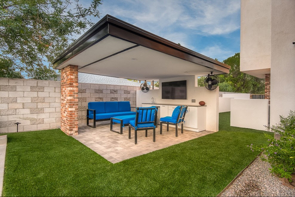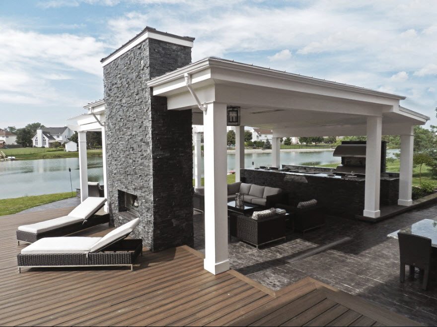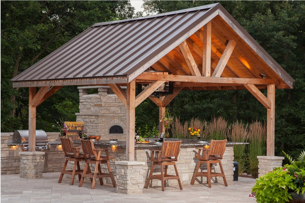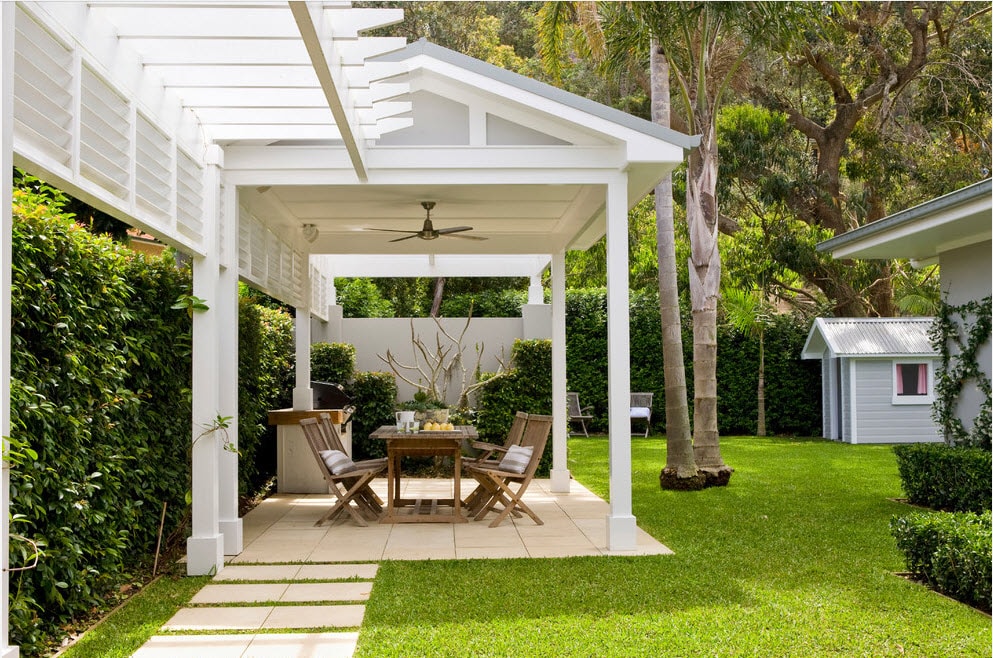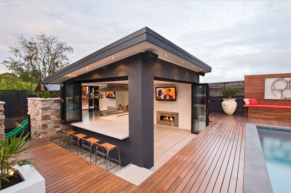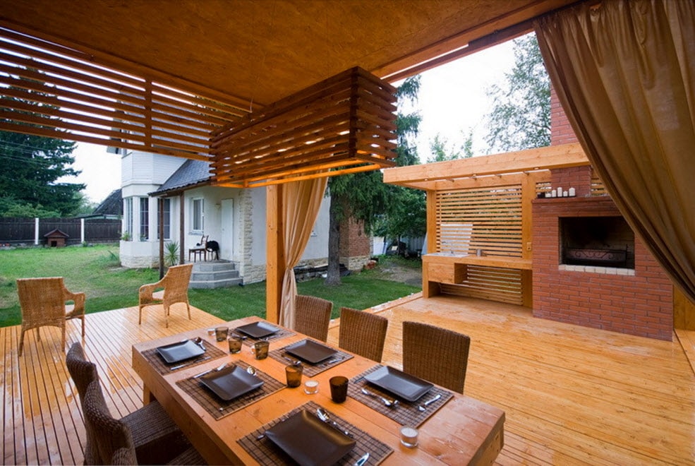 Vous pouvez faire une sorte de verrière. Mais si vous faites déjà des efforts, il est préférable de créer un kiosque de jardin dans lequel vous pourrez facilement préparer vos repas. La construction doit être de type semi-fermé ou ouvert. Lorsque vous organisez un barbecue, un gril ou un barbecue, vous devez tout d’abord veiller à la sécurité incendie, ainsi qu’à un lieu de stockage du bois de chauffage, du charbon, de la vaisselle et mettre une table de coupe.