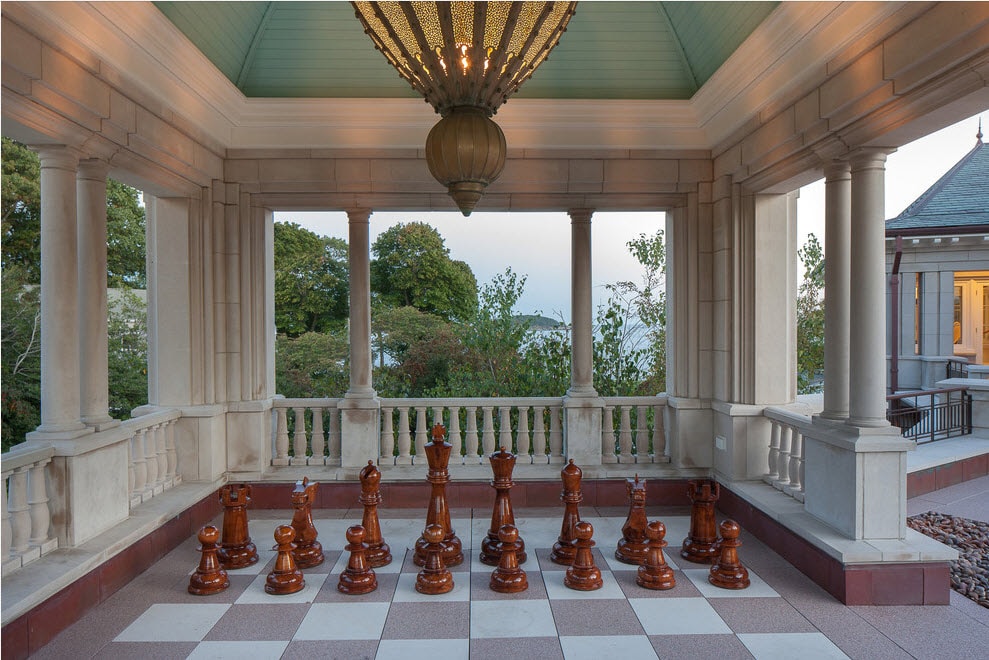 À côté de la maison monumentale, un belvédère en pierre conviendra. Il existe des options similaires aux bâtiments anciens ou aux petits palais. L'utilisation de matériaux de décoration en très petites quantités peut produire un effet plus sobre.