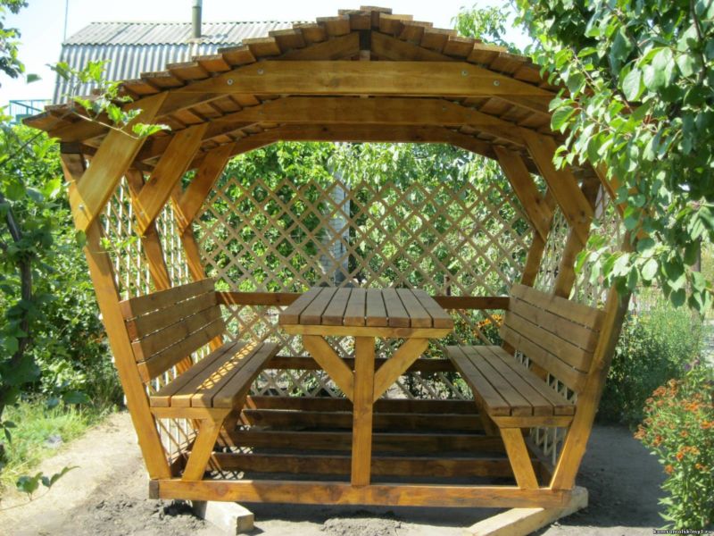 Il est agréable et facile de travailler avec des matériaux aussi naturels que le bois. En choisissant cette conception, vous pouvez être sûr de la sécurité. Contrairement aux matériaux «non vivants» modernes, l’arbre procure un sentiment d’unité avec la nature, d’harmonie et peut se fondre dans n’importe quel paysage du site. Et ce matériel est très pratique. Le bois exposé avec un vernis de haute qualité ne perd pas ses propriétés physiques, même après 25 ans.