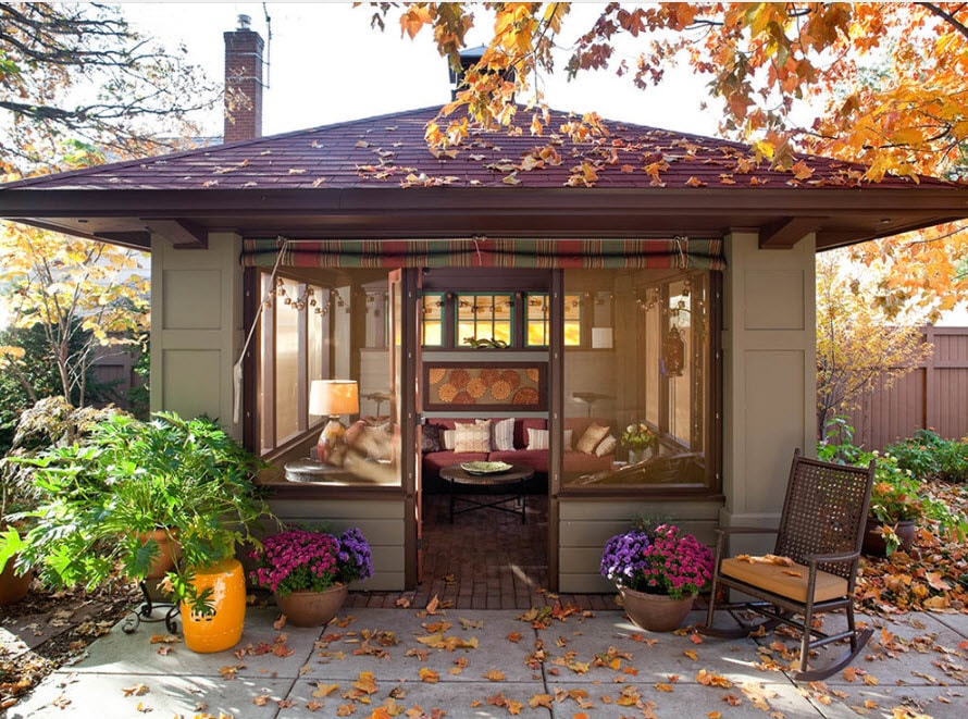 Ce bâtiment, originaire des pays tropicaux, bien que de petite taille, peut toutefois accueillir tous les éléments nécessaires à la détente. Le gazebo de style bungalow a rassemblé certaines des caractéristiques stylistiques d'un tel bâtiment.