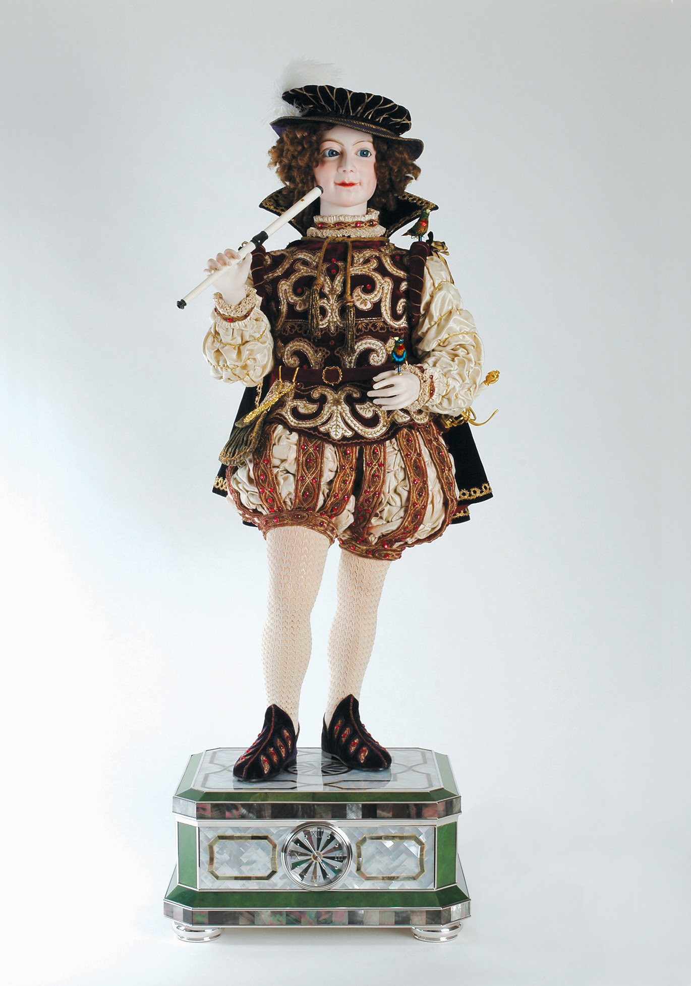 "Birds" est la poupée la plus chère du monde. Elle atteint une hauteur de 1,2 m La poupée est vêtue d'une élégante tenue Renaissance. Dans la main du dompteur se trouve la flûte sur laquelle il joue. Les oiseaux assis sur les épaules et les bras agitent périodiquement leurs ailes, chantent et tournent la tête. La poupée est capable de bouger et de faire des sons grâce au mécanisme d'horlogerie. Volaille faite en un seul exemplaire. Il est composé de 2000 pièces. Il a fallu 2 ans pour l'assembler, c'est pourquoi il est si précieux et si demandé. Le coût d'une poupée mécanique est de 6 millions de dollars.