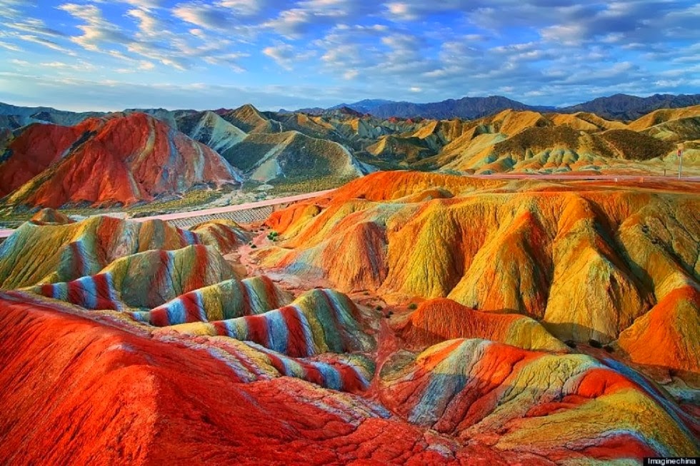Maintenant nous sommes en Chine. Les roches Zhangye Danxia sont une formation de roches que l'artiste invisible a peintes de différentes couleurs - vert, orange, jaune, écarlate et gris-bleu. Il est préférable de regarder cette beauté à l'aube ou au coucher du soleil, lorsque les roches brillent dans des teintes différentes et changent de couleur tout le temps.