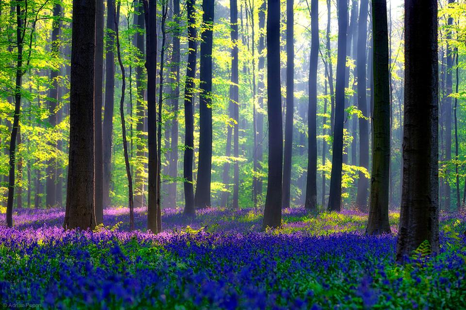 Belgique Chaque printemps, la forêt de Hallerbos se transforme en un lieu étonnant dans les tons bleus. Ce miracle est créé par une mer de cloches en fleurs. La beauté bleue du couvre-lit se répand dans la forêt et crée un look enchanteur. Par temps ensoleillé, lorsque les rayons du soleil pénètrent dans les cimes vertes des arbres, la vue est particulièrement fabuleuse.