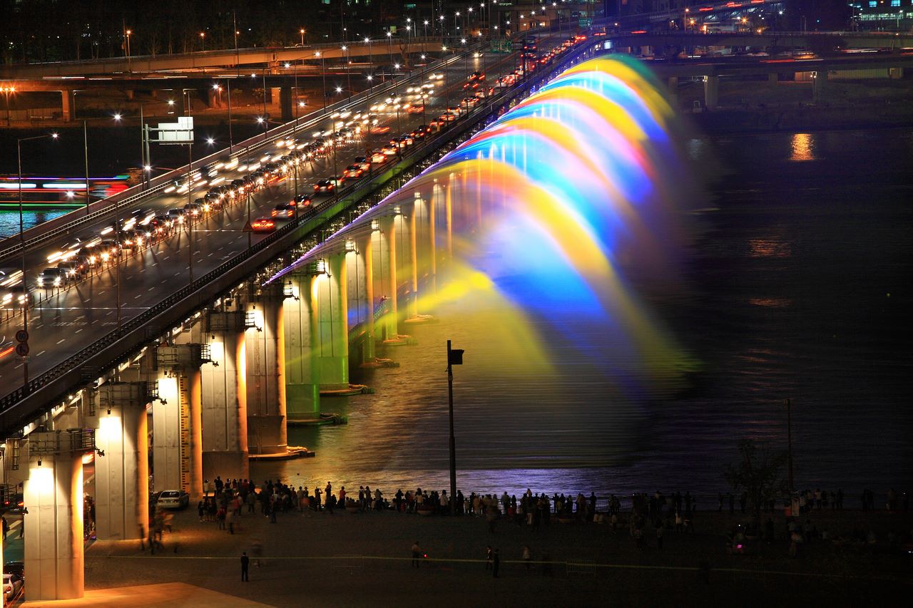 Le pont le plus beau et le plus original au monde est considéré comme le pont de la fontaine Banpo à Séoul, en Corée du Sud. Il est impossible de décrire avec des mots ce qui constitue cette combinaison unique d’un pont sur une rivière et d’une belle fontaine colorée. À propos, la fontaine du pont de Banpo est inscrite dans le livre des records comme étant la plus longue fontaine du monde. Les jets de fontaine, situés sur toute la longueur du pont des deux côtés, ressemblent à une cascade. L’éclairage multicolore des jets d’eau donne l’impression de danser des jets. Il est impossible de quitter les yeux d'un tel spectacle, c'est pourquoi cet endroit est très prisé des touristes. La splendeur incroyable de ce bâtiment semble unique la nuit. Vous obtiendrez beaucoup des meilleures impressions.