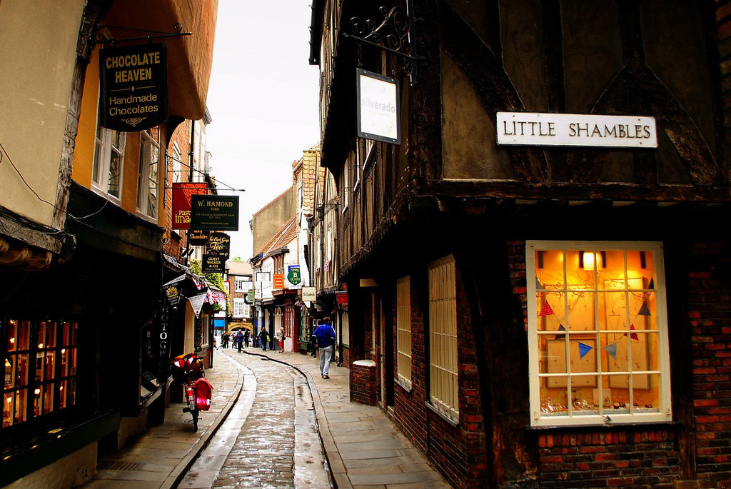 L'Angleterre La ville de York. La rue Chambles est le charme des vieux bâtiments avec des cadres en bois et des courbes inhabituelles. En marchant dans cette rue, vous serez étonné de voir comment ces maisons complexes peuvent être suspendues juste au-dessus de votre tête.