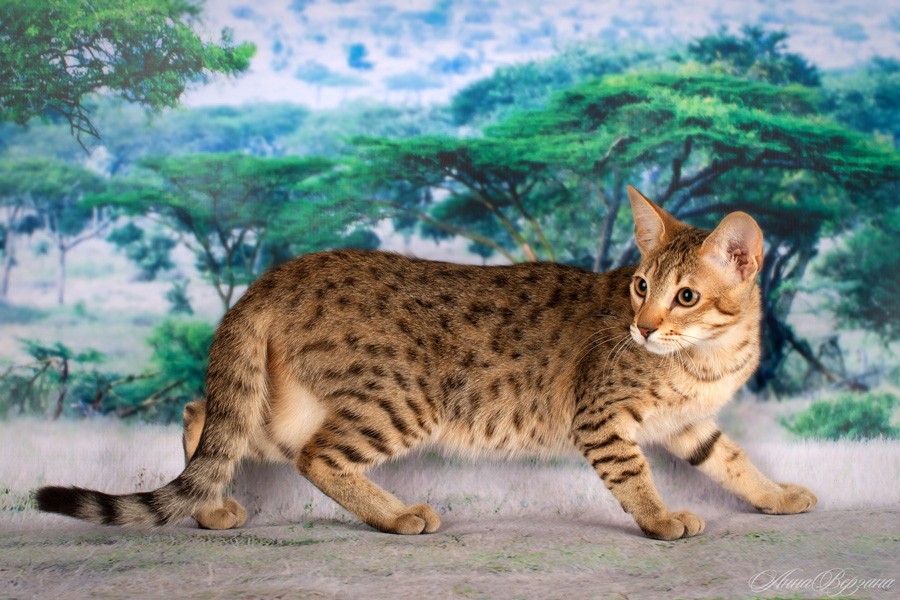 Les parents de ce géant sont le serval africain sauvage et le chat domestique le plus ordinaire. Depuis le premier parent, la savane a conquis l’amour de l’élément eau, une capacité de saut incroyable (jusqu’à 3 mètres environ), de longues jambes, de grandes oreilles, une couleur tachetée. Cette race de chat aime nager. Dans l'eau, il peut parcourir de grandes distances.