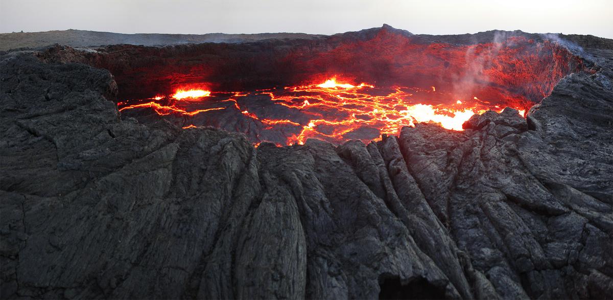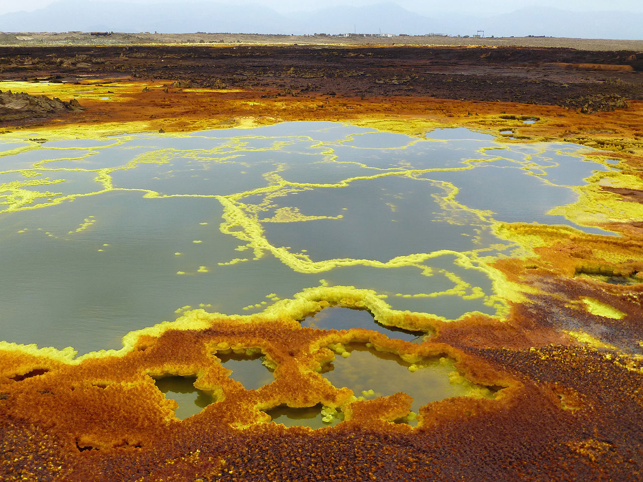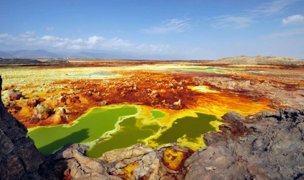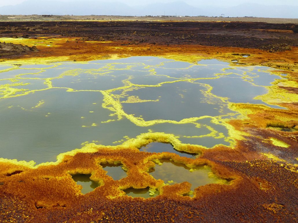 La beauté de cet endroit est trompeuse et très dangereuse. Le creux a été découvert par les voyageurs au début du 20ème siècle dans le nord du désert éthiopien appelé Danakil. La température de la terre à cet endroit atteint +70 degrés et l'air se réchauffe jusqu'à +63 degrés. C'est l'endroit le plus chaud de la planète.