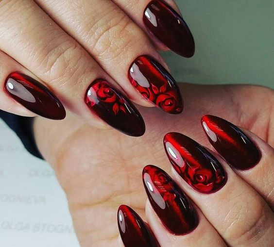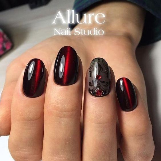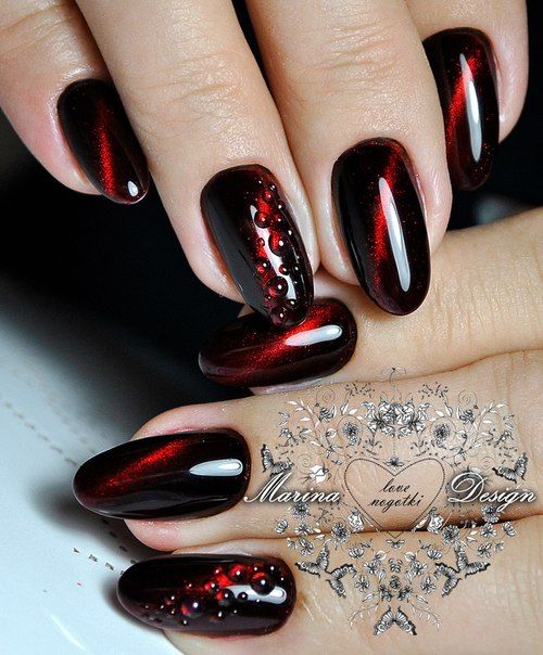 La manucure "oeil de chat" convient aux amateurs de l'effet 3D sur les ongles. Ce vernis, qui contient des particules de métal, a rapidement pris une place de choix dans le classement de l’industrie des ongles. Le secret principal du succès de la conception «œil de chat» réside dans l’utilisation d’aimants spéciaux qui, grâce à leur champ magnétique, agissent sur un vernis spécial qui n’a pas encore séché et qui créent un motif incroyablement beau. Plus efficace, un tel revêtement apparaît dans les tons sombres, en particulier en rouge.