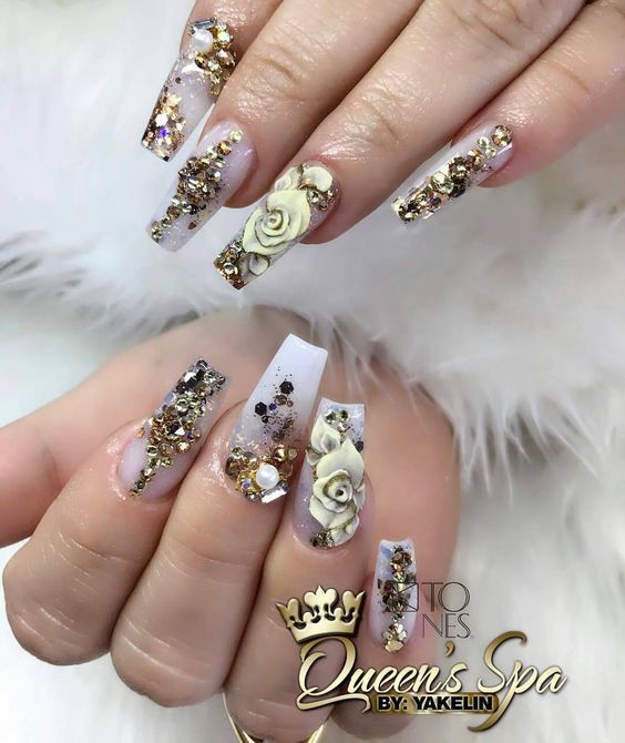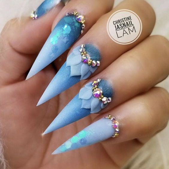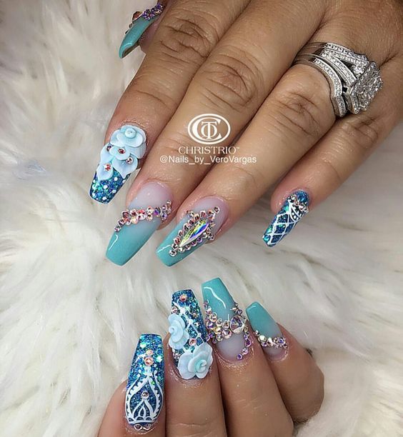 Il est difficile de perdre de vue le design inhabituel utilisant des flocons de yucca. Une telle manucure est considérée comme une très bonne option pour le printemps, car elle est entraînante, enjouée et audacieuse. Il attire les yeux des passants, il peut être admiré pendant au moins une éternité. Convient à l'agitation quotidienne.