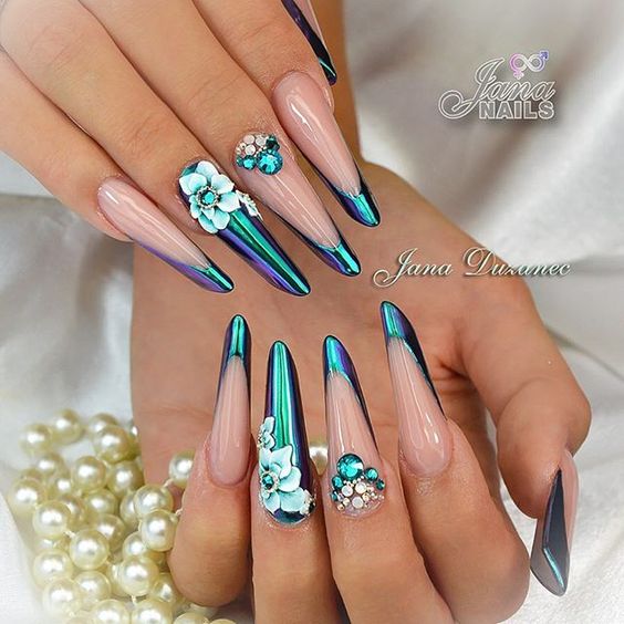 Si vous voulez essayer quelque chose de nouveau et d’inhabituel, nous vous recommandons d’utiliser une poudre de pigment, chez l’homme du peuple - frottez. Il peut être de différentes nuances, mais le frottement du miroir est particulièrement intéressant. Sur les ongles courts, il est préférable d'appliquer un frottement holographique ou perlé, sur les longs un effet arc-en-ciel.