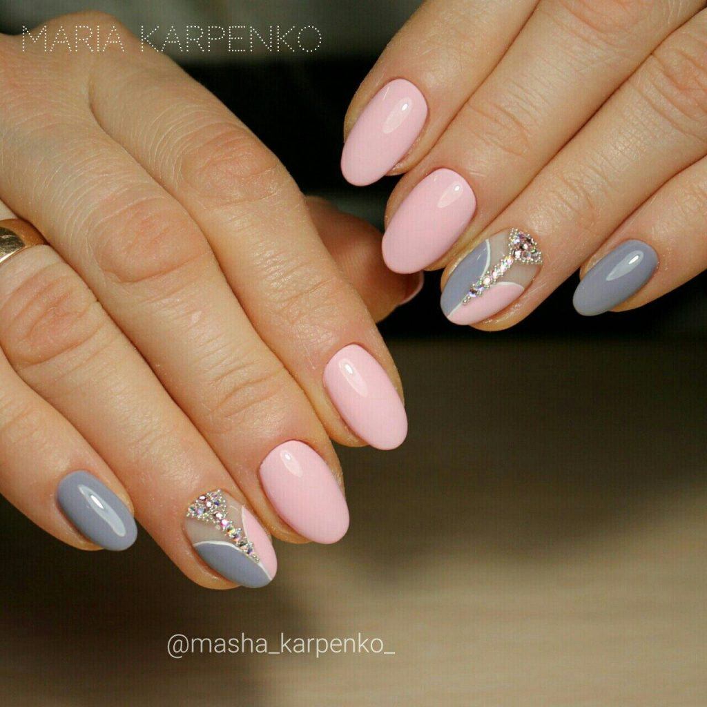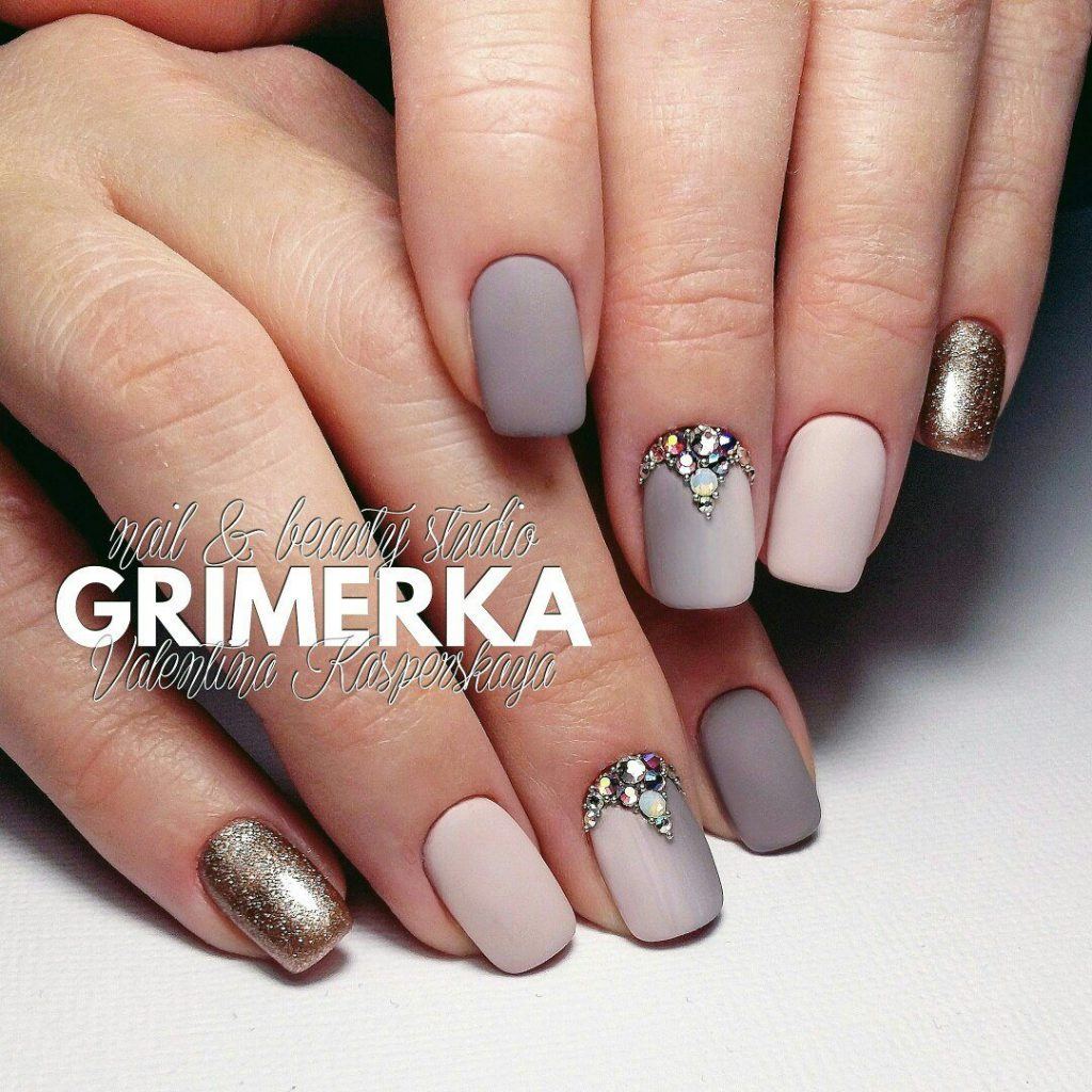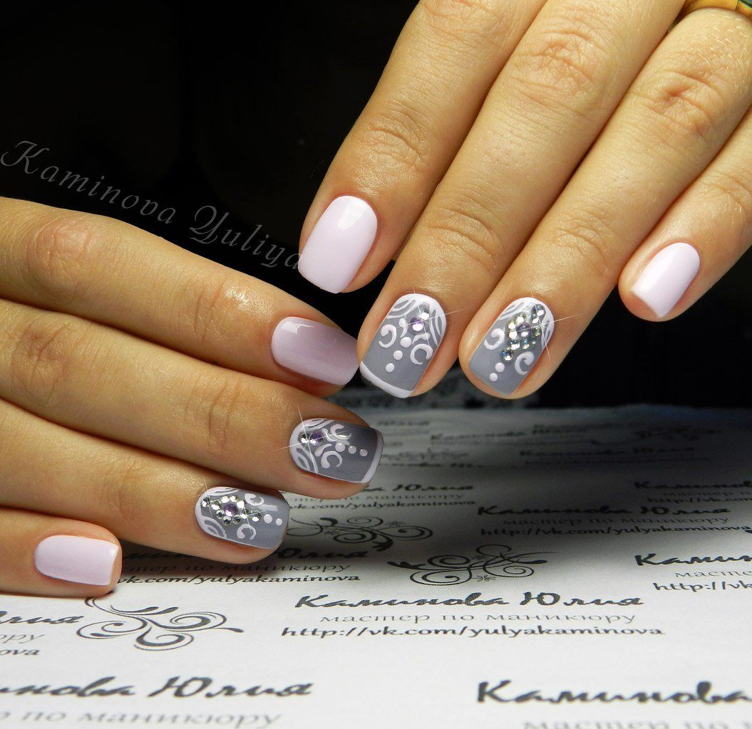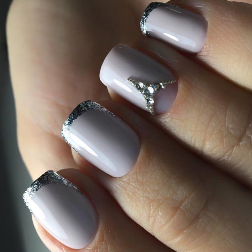Tout le monde le sait depuis longtemps: pour donner à la manucure un aspect riche et incroyablement chic, vous pouvez utiliser des strass sur tout. Après tout, avec l'aide de pierres brillantes, les ongles féminins deviennent simplement expressifs et capables d'attirer l'attention des autres. Les strass peuvent être utilisés pour décorer la ligne du sourire, ainsi que des éléments supplémentaires pour créer l'ornement principal. Par exemple, si le souci sans nom aura un motif en forme de fleurs, les strass peuvent être utilisés comme décoration du cœur du bouton. Certains maîtres proposent de décorer la veste grise avec des strass, qui remplissent près de la moitié de la plaque à ongles. Cette option a un look très élégant et est en parfaite harmonie avec la robe de soirée.